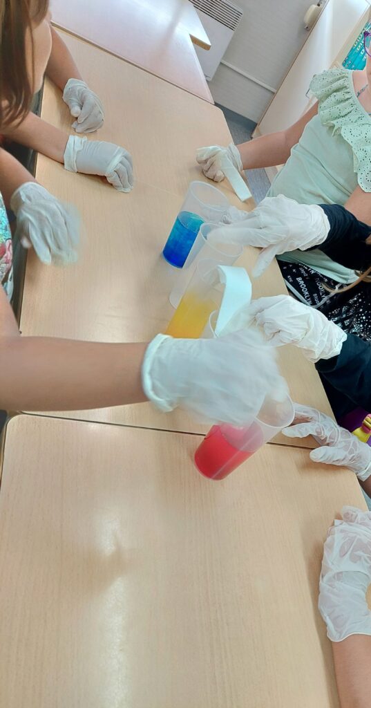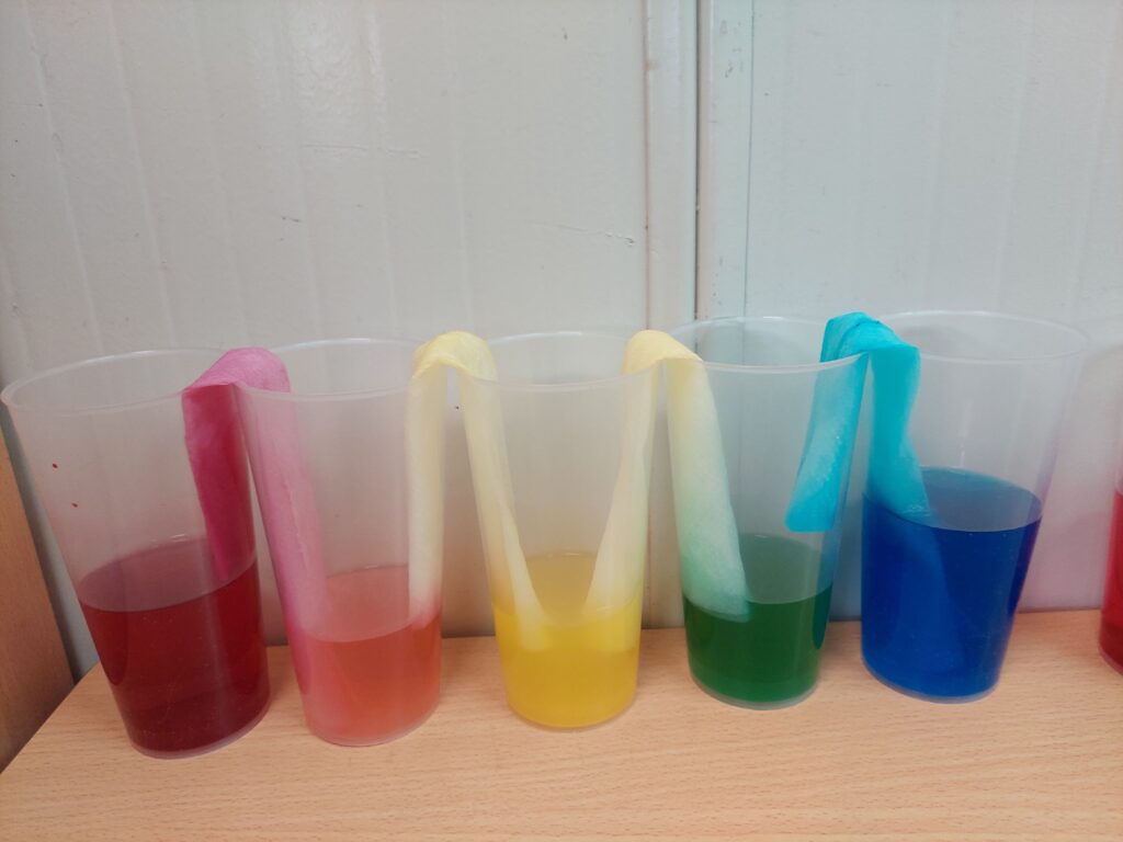 El segon experiment és “l’aigua que camina”, aquest experiment tracta de col·locar gots amb aigua i colorant de diferents colors, després ajuntar-los amb quatre tovallons tocant l’aigua, així l’aigua viatjarà pels tovallons i pintarà l’aigua del got del costat.