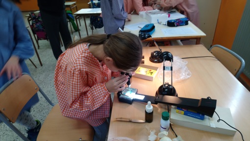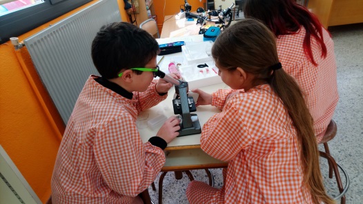 A l’escola tenim un microscopi, el Biel va portar el seu i també va venir el Fermí, un mestre de ciències jubilat, que en va portar un altre i una lupa binocular. Ell, quan treballava, tenia un laboratori a l’escola i ens va explicar com ho havíem de fer per poder veure les cèl·lules d’alguns éssers vius. Ens va ensenyar com funciona el microscopi.