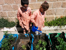 Els nens i nenes anem a regar en grups de dos i observem com estan les escaroles, els enciams, les tomaqueres “cherry” i les llavors de ruca i julivert. Després expliquem als companys i companyes el que hem vist.