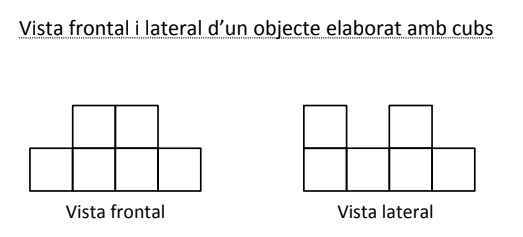 Amb 6 cubs ja es pot fer una construcció que tingui aquestes dues vistes, però alguns cubs queden separats i algun només es toca per una aresta. Cal que hi hagi sempre contacte entre almenys una cara dels cubs per a considerar que es tracta d’un objecte? En aquest cas el mínim serien 9 cubs.