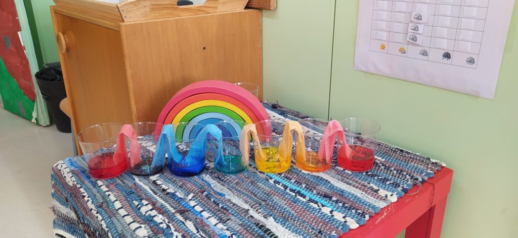 - “L’AIGUA QUE CAMINA”, pel qual vam necessitar 7 gots, aigua, colorant (vermell, blau i groc), paper de cuina i unes hores d’espera per veure resultats. A l’endemà de fer l’experiment en arribar a l’escola els colors de l’arc de Sant Martí havien aparegut als gots. Quina sorpresa!!!