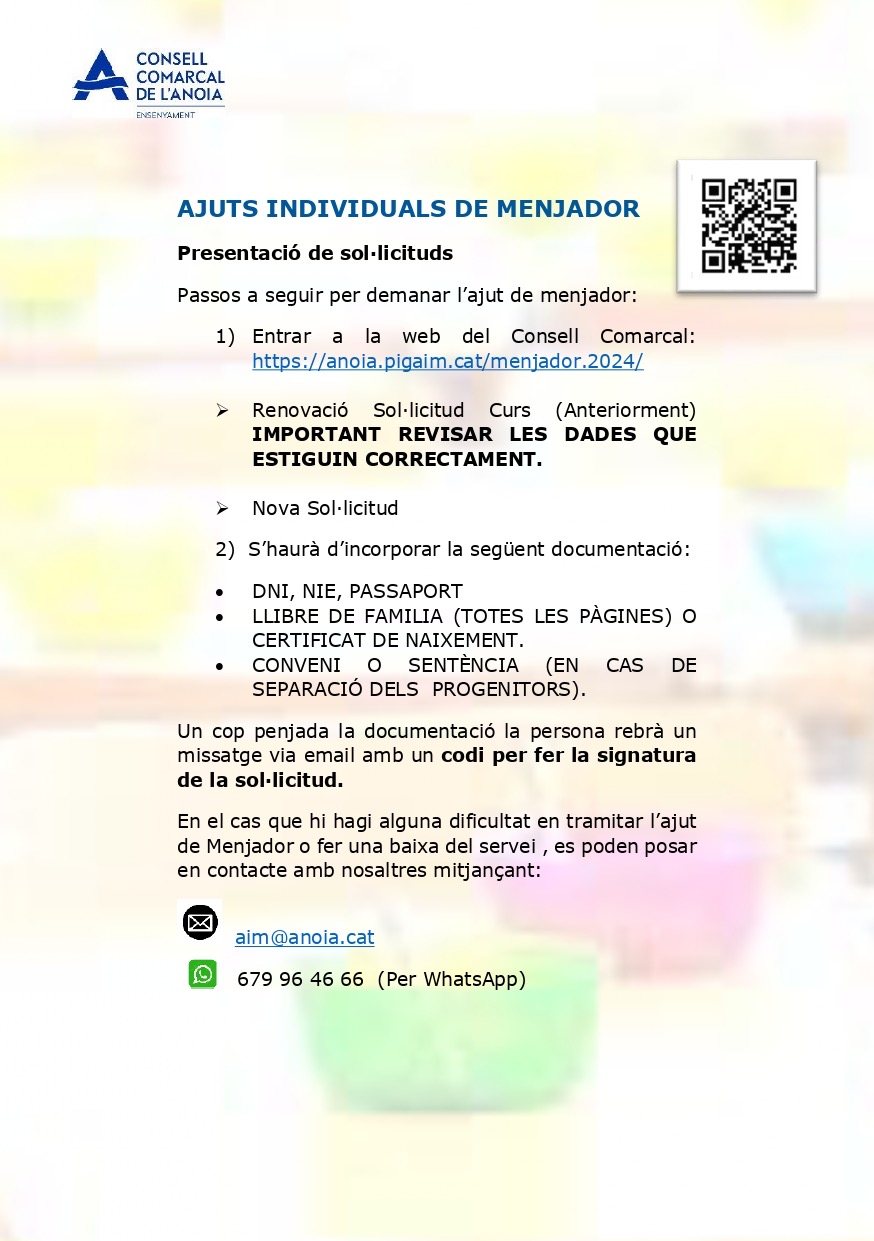 Per qualsevol dubte podeu consultar https://www.anoia.cat/departaments/ensenyament/ajuts-individuals-de-menjador/ o enviar un correu electrònic a: aim@anoia.cat