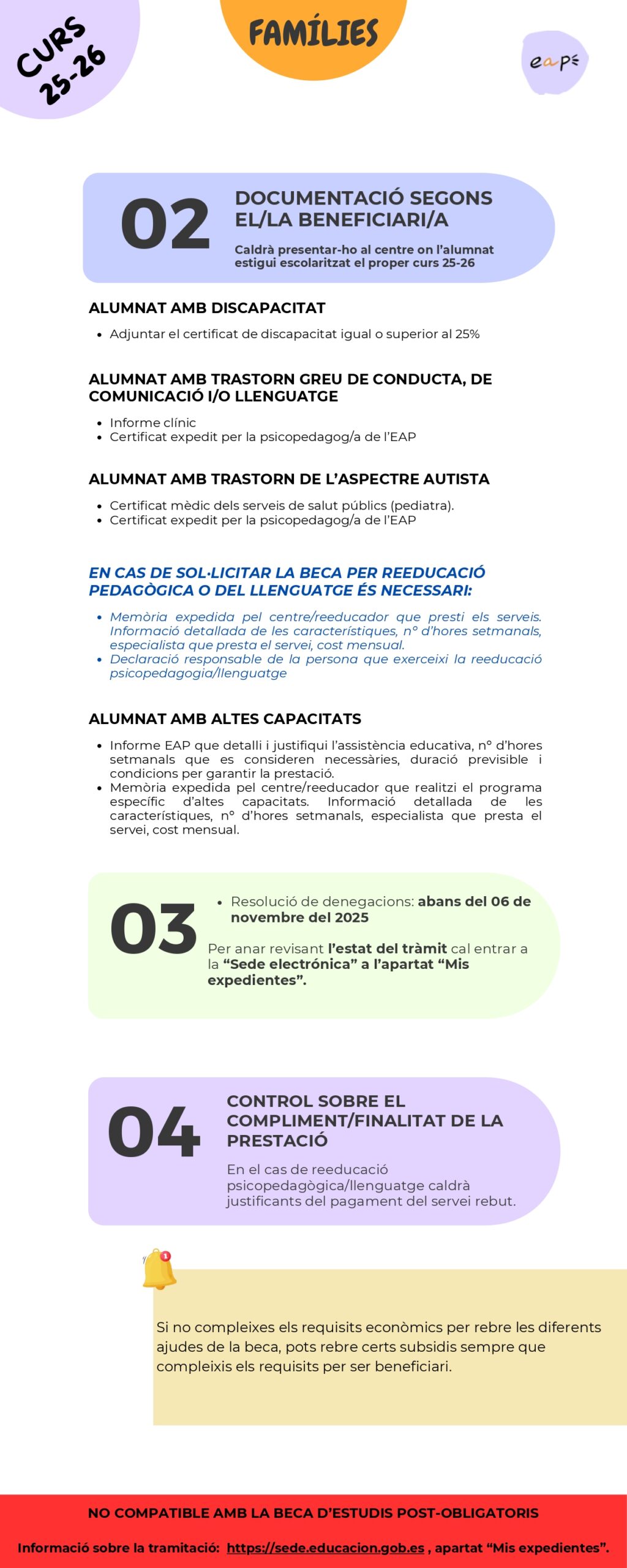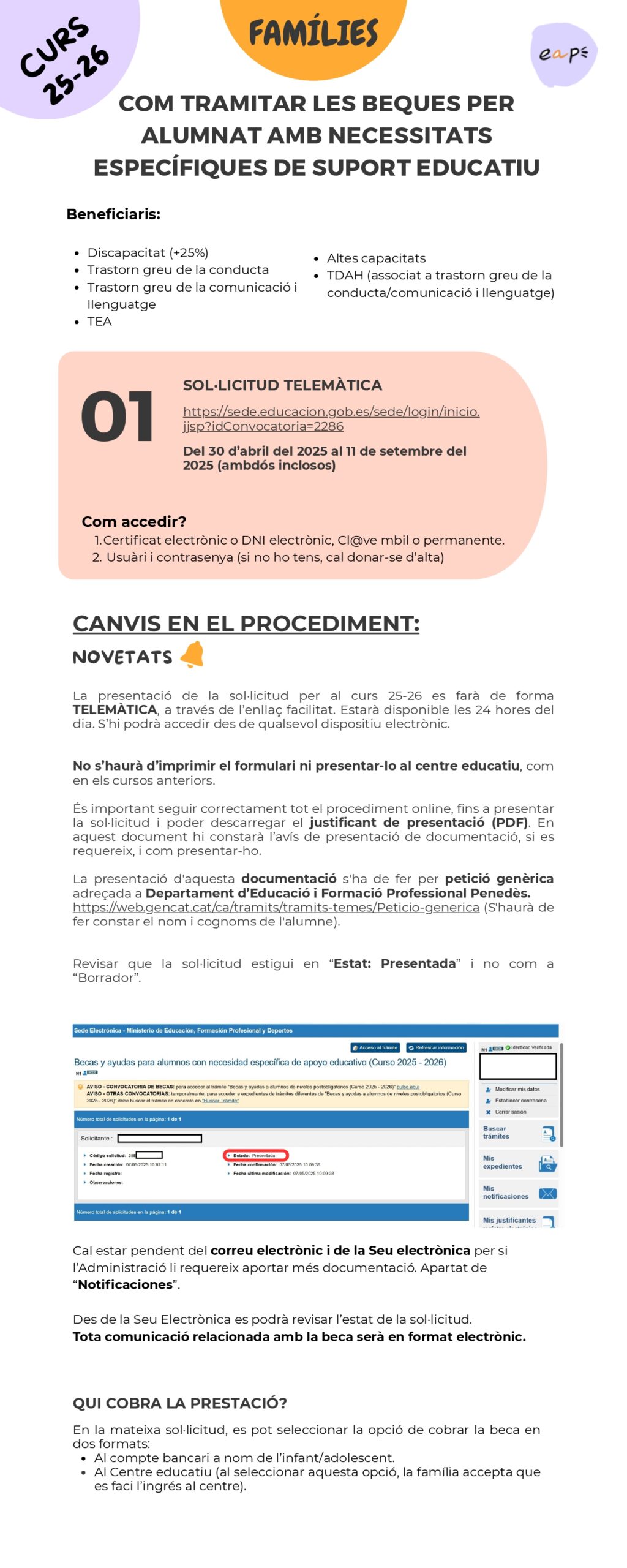 Us podeu informar AQUÍ i per poder-la sol·licitar cal fer-ho AQUÍ i presentar-la a l’escola a partir del 30 d’abril de 2025, fins a les 24:00 hores, de l’11 de setembre de 2025.