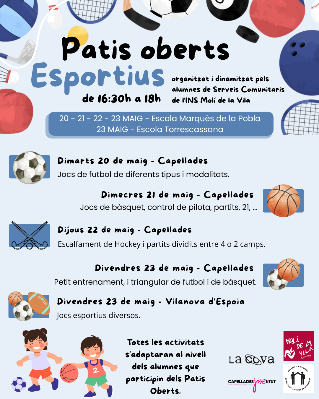 Els dies 20, 21, 22 i 23 de maig els patis oberts estaran dinamitzats a través de diferents esports. A continuació podreu veure la proposta que hi ha per cada un dels dies: