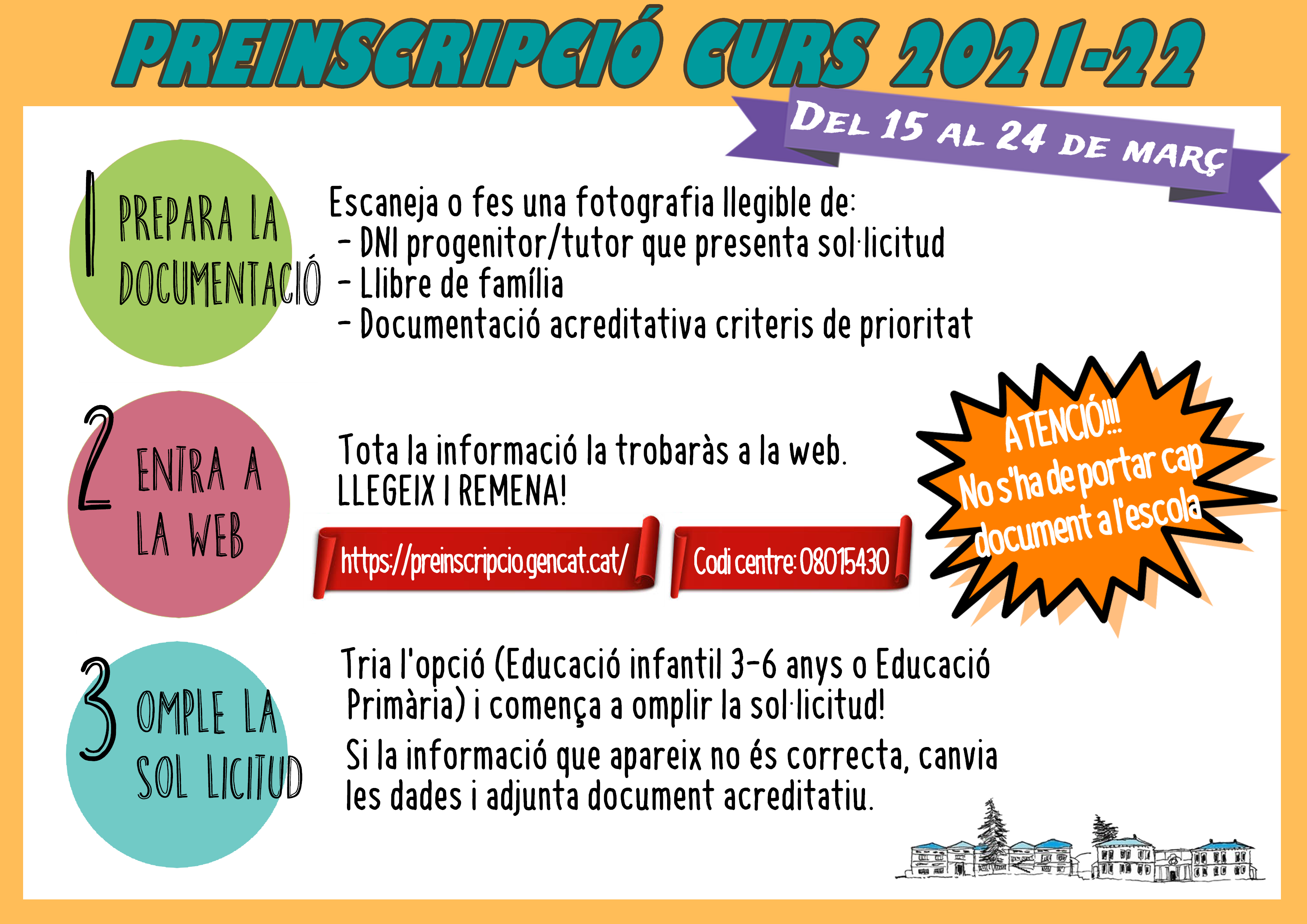 A continuació teniu indicats els passos necessaris per completar telemàticament la preinscripció pel curs 2021-22. Feu clic per accedir al web preinscripcio.gencat.cat