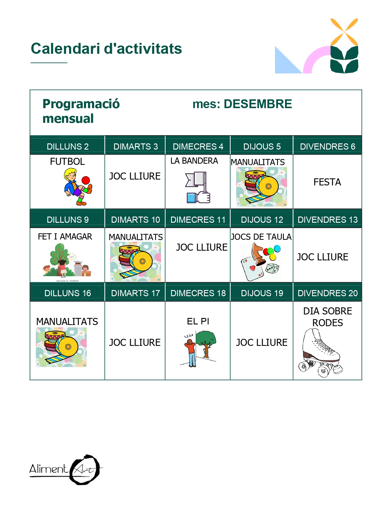Aquí podeu consultar el calendari amb totes les activitats que tenim preparades per als migdies al menjador durant el mes de desembre. Cada setmana hem organitzat diferents dinàmiques, jocs i propostes, perquè els nens i nenes gaudeixin d’estones divertides i enriquidores durant l’estona de menjador.