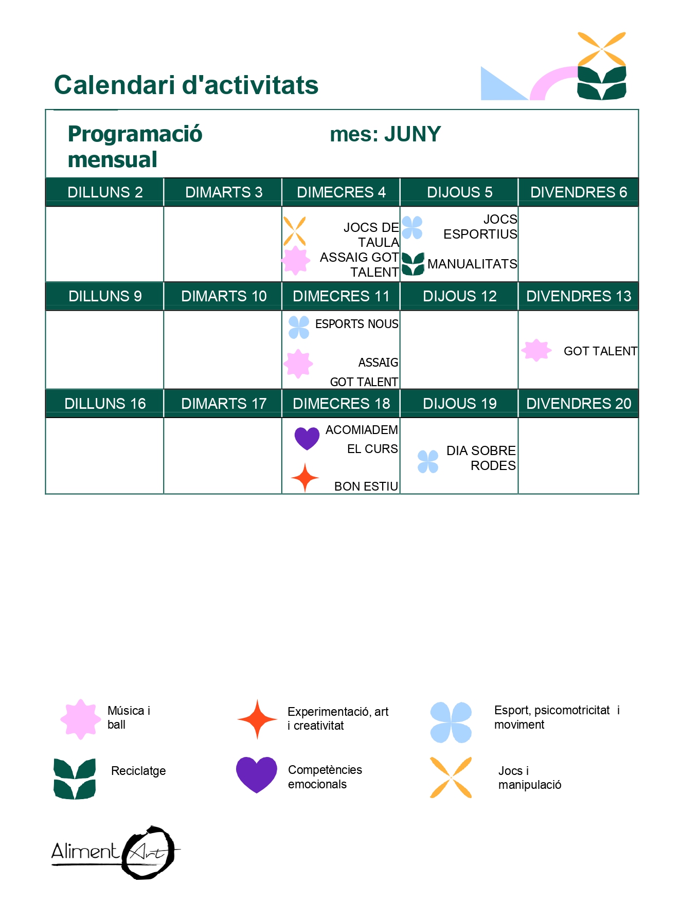 Us compartim el calendari amb les activitats que es realitzaran al menjador durant aquest mes de juny!