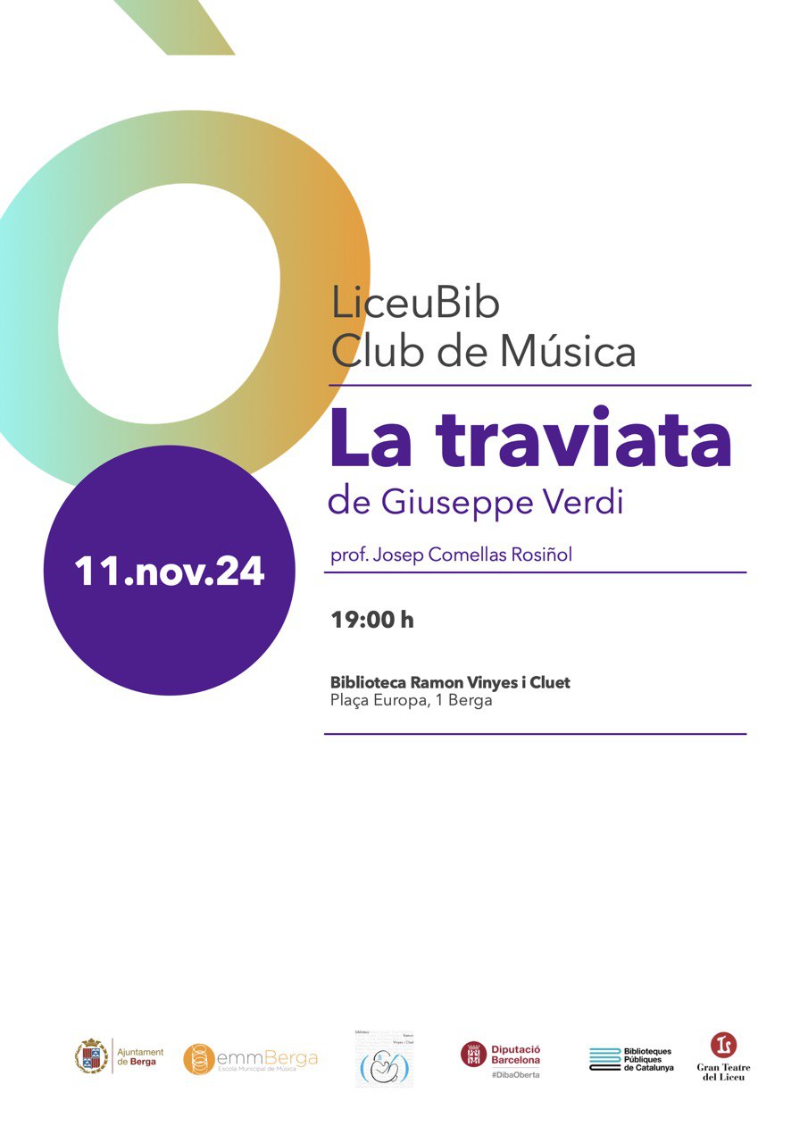 El club de música es trasllada aquest mes a la Biblioteca de Berga. En col·laboració amb aquest centre, dins de la iniciativa LiceuBIB, el programa per difondre i acostar el món de l’òpera i les seves gran obres entre el públic de les biblioteques públiques, la sessió mensual es traslladarà a la Biblioteca. El tema d’aquest mes serà l’Òpera “La Traviata” de Giuseppe Verdi. El club de música és conduit pel professor Josep Comellas Rosiñol.
