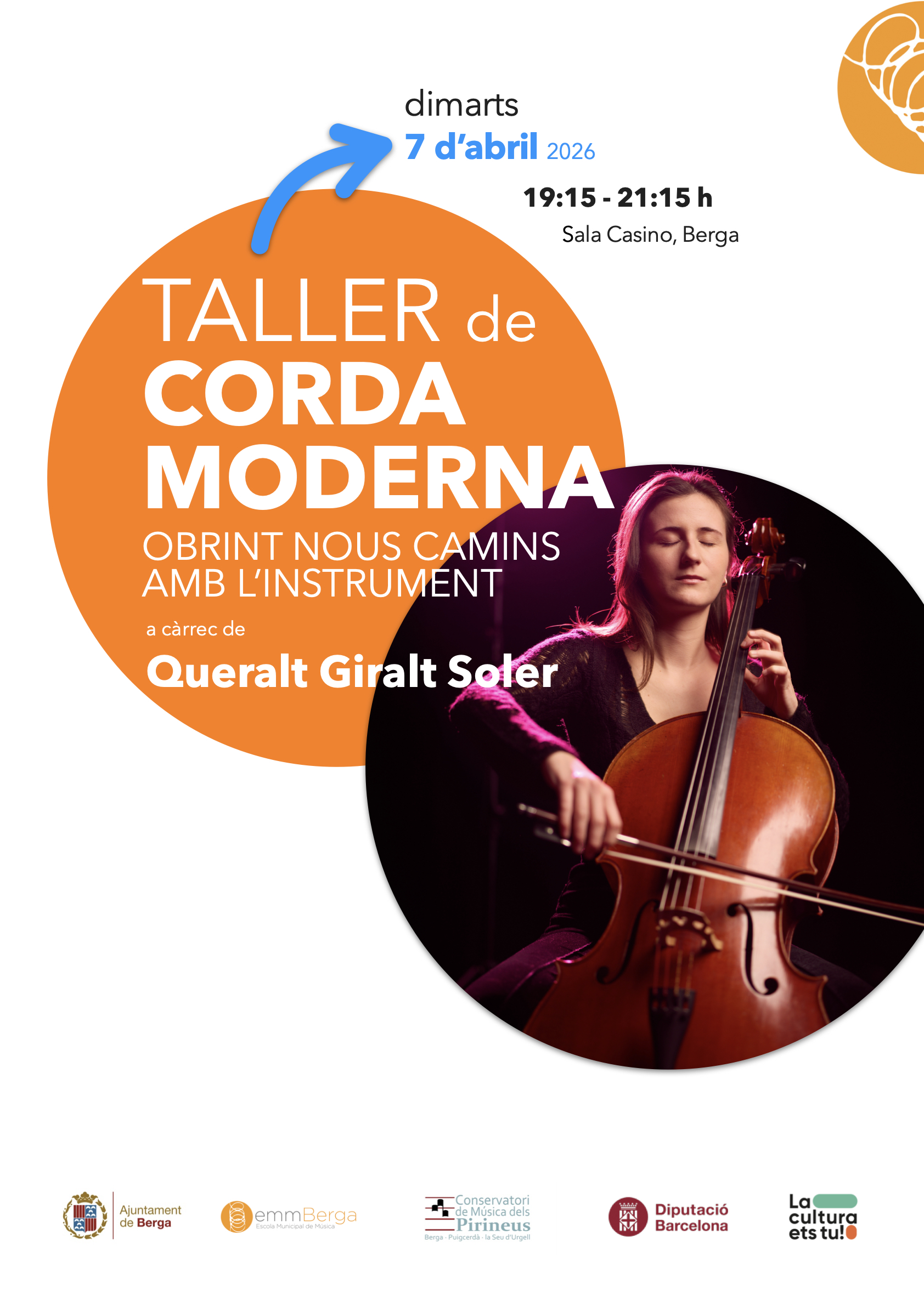 Aquest dimarts, a partir de les 19:15 h, l’alumnat de l’orquestra de l’escola participarà en un taller de corda moderna conduit per Queralt Giralt Soler. La sessió se centrarà en el treball d’aquesta violoncel·lista, cantant, compositora i educadora musical.