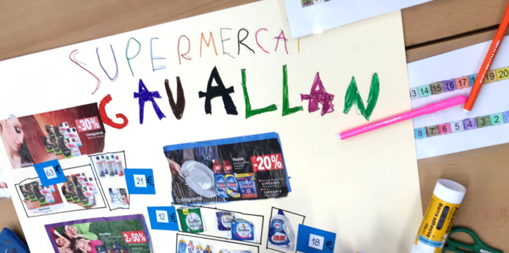 En dues tardes de dilluns destinades a tallers ens vam reunir per grups i vam mirar preus de productes en revistes de propaganda de supermercats. Vam elaborar un mural amb un nom inventat de botiga i vam enganxar imatges de productes amb el que costaven. Amb bitllets i monedes de joguina practicàvem com pagàvem tot allò que compràvem.