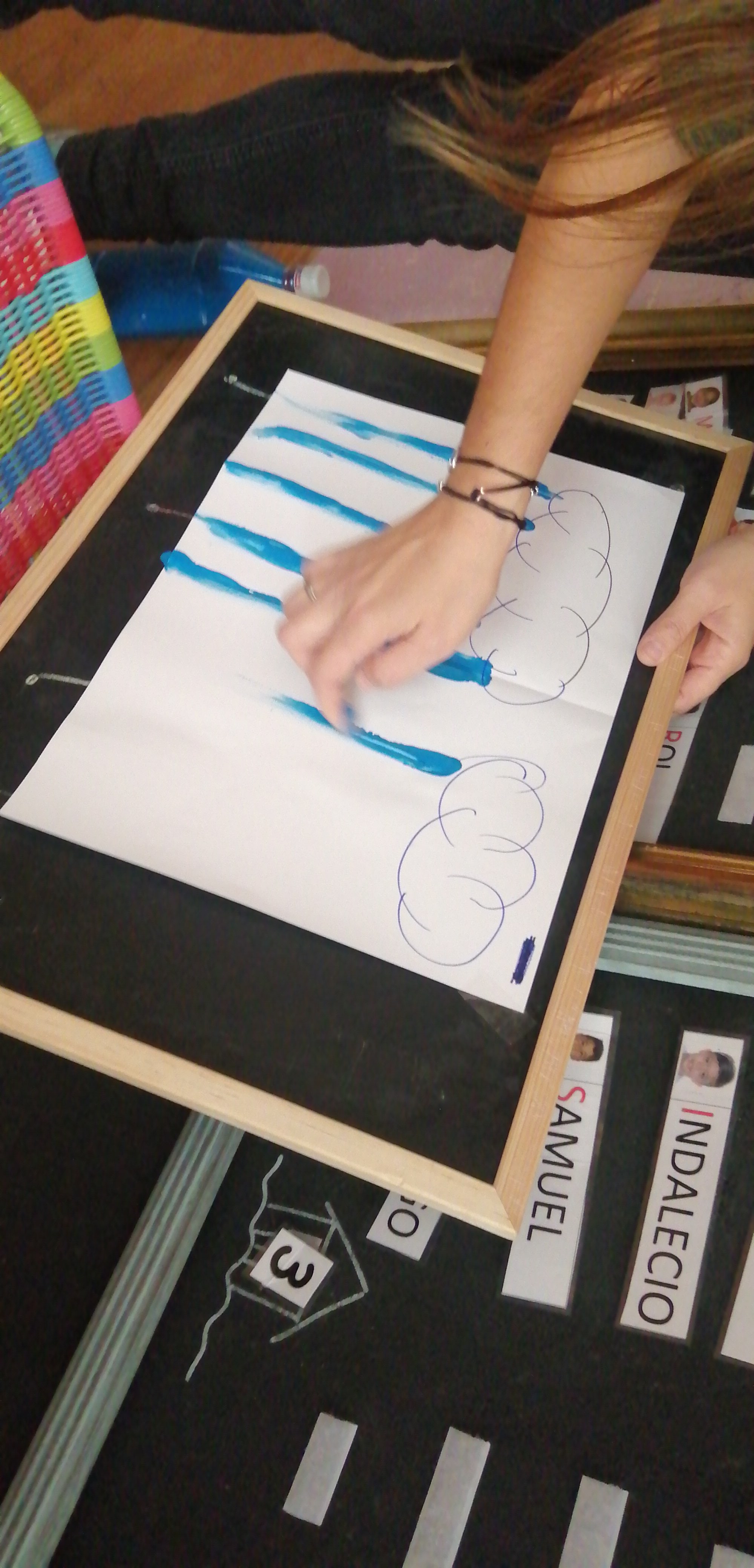 Hem treballat el traç vertical, tot dibuixant una pluja que cau de dalt, a baix, amb pintura!!