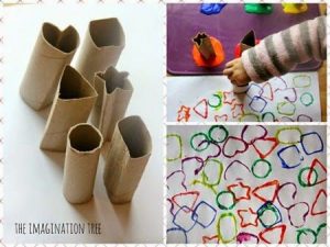 Abans de començar l’activitat, cal preparar un paper i rotllos de paper de vàter adaptats amb tres formes geomètriques: quadrat, triangle i cercle. Si no es tenen suficients rotllos, es poden fer amb altres materials que permetin fer aquestes formes (un tros de cartró lligat amb celo o amb una goma elàstica, una càpsula de nexpresso, etc.) Els infants escullen 3 colors de pintures (es pot fer amb colorant alimentari, aquí teniu un enllaç que us diu com poder-les fer https://www.guiainfantil.com/articulos/ocio/manualidades/como-hacer-pintura-casera-para-los-ninos/) i decideixen de quin color estamparan cada figura geomètrica, per exemple; quadrat blau, cercle vermell i triangle groc. Després hauran d’estampar tot el paper mitjançant els rotllos o els altres materials que permetin fer aquestes formes. En acabar, poden comptar quants cercles, quadrats i triangles han fet i poden assenyalar on són els cercles, els quadrats, etc.