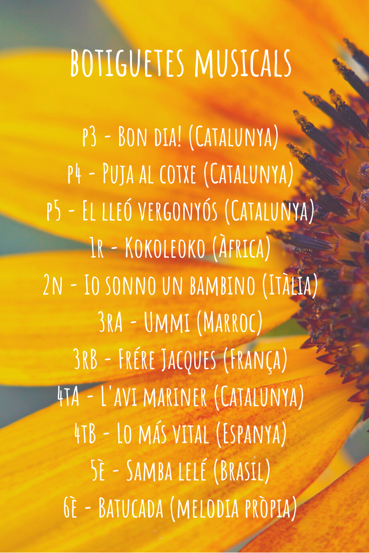 Botiguetes Musicals 2021 Feu un comentari / Per admin / 26 de març de 2021 / Botiguetes Musicals General / Botiguetes Musicals, Comunitat de grans, Comunitat de petits, Música Per acomiadar el segon trimestre i donar la benvinguda a la primavera, avui hem celebrat un concert molt especial al pati. Cada curs ha interpretat diferents cançons de països del món.