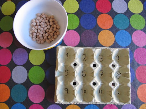 Heu d’escriure els números fins al 12 amb retolador com a la foto (us pot ajudar algú de casa), i després heu d’omplir cada forat amb el número de cigrons que posa.