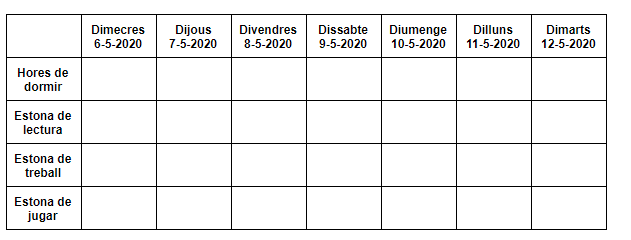 Per tal de recollir tota aquesta informació, us facilitem una graella que us recomanem que copieu a la vostra llibreta o en un full, ja que us anirà molt bé per anar omplint cada dia.