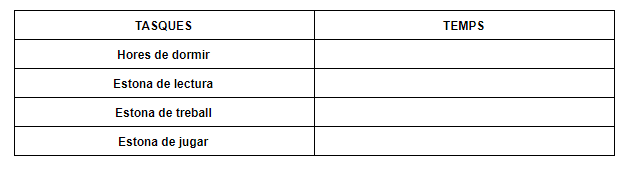 Una vegada tingueu omplerta la graella anterior, haureu de sumar totes les hores de dormir, totes les estones de lectura, totes les estones de treball i totes les estones de jugar. El resultat de cada suma l’haureu de col·locar dins de la següent graella per tal de poder fer un gràfic de barres i poder veure aquests resultats mitjançant aquest gràfic. Us recomanem que també copieu la següent graella amb els resultats finals en la vostra llibreta o en un full.