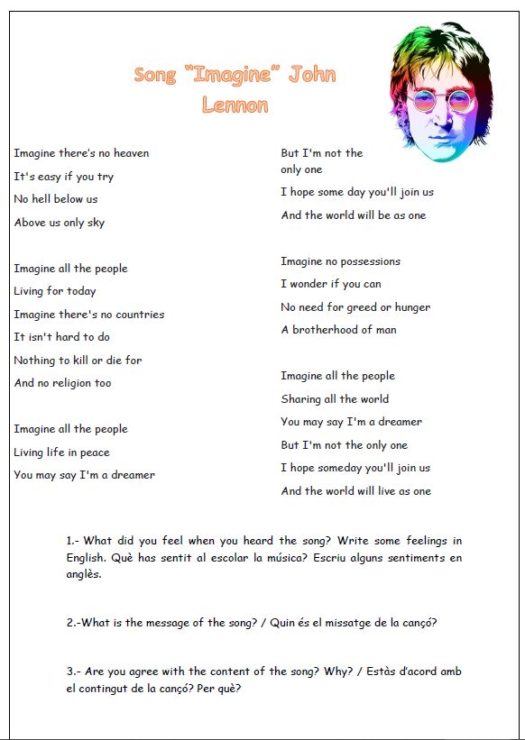 Here you have a song by the famous British singer John Lennon that sing some boys and girls from different cultures. Listen it carefully and then look at the sheet below.