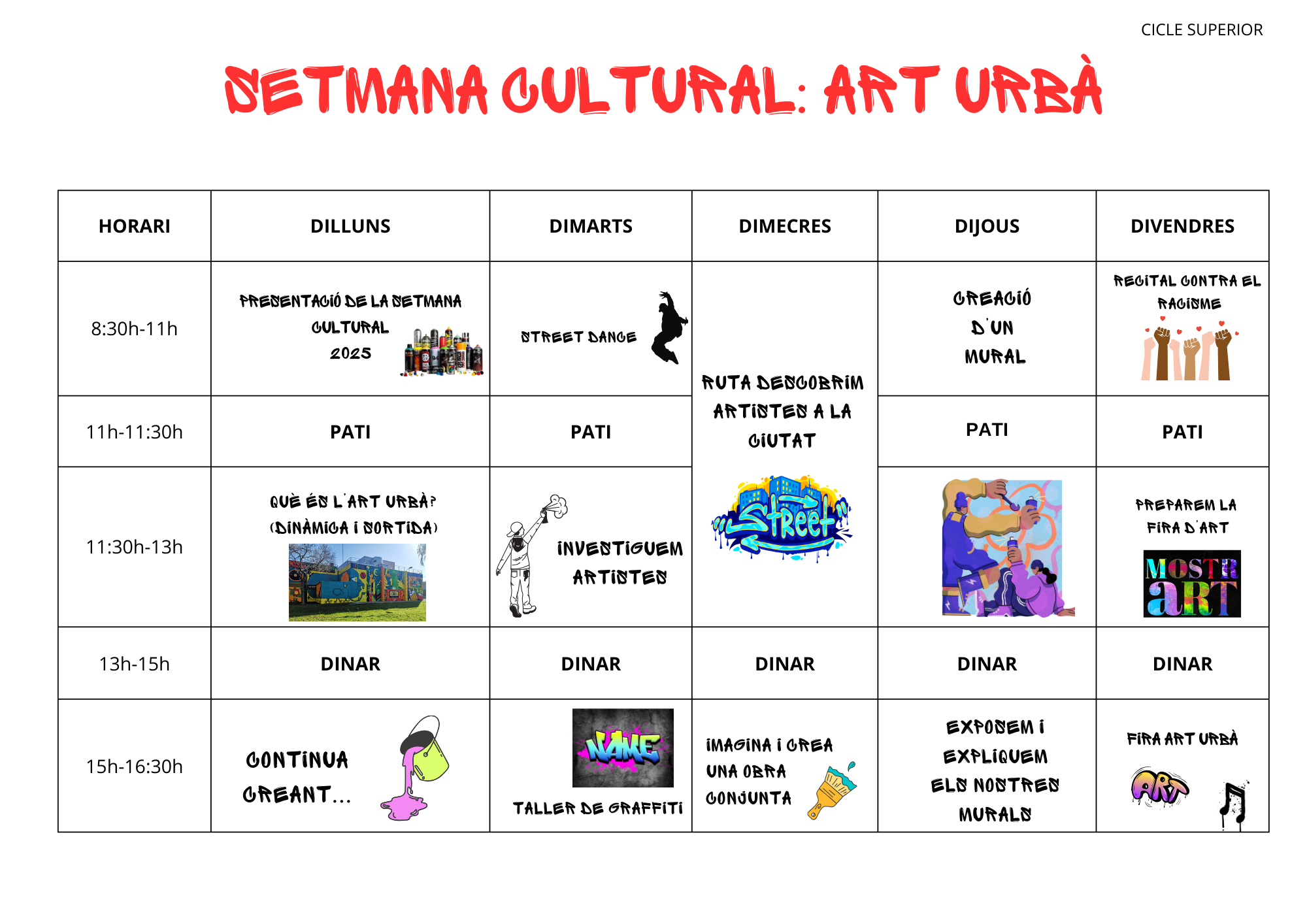 Setmana Cultural 2025 Feu un comentari / Per admin / 17 de març de 2025 / Cicle Superior Educació Primària Comencem la Setmana cultural! Aquest serà el nostre horari aquesta setmana, recordeu que dimecres anem de sortida.