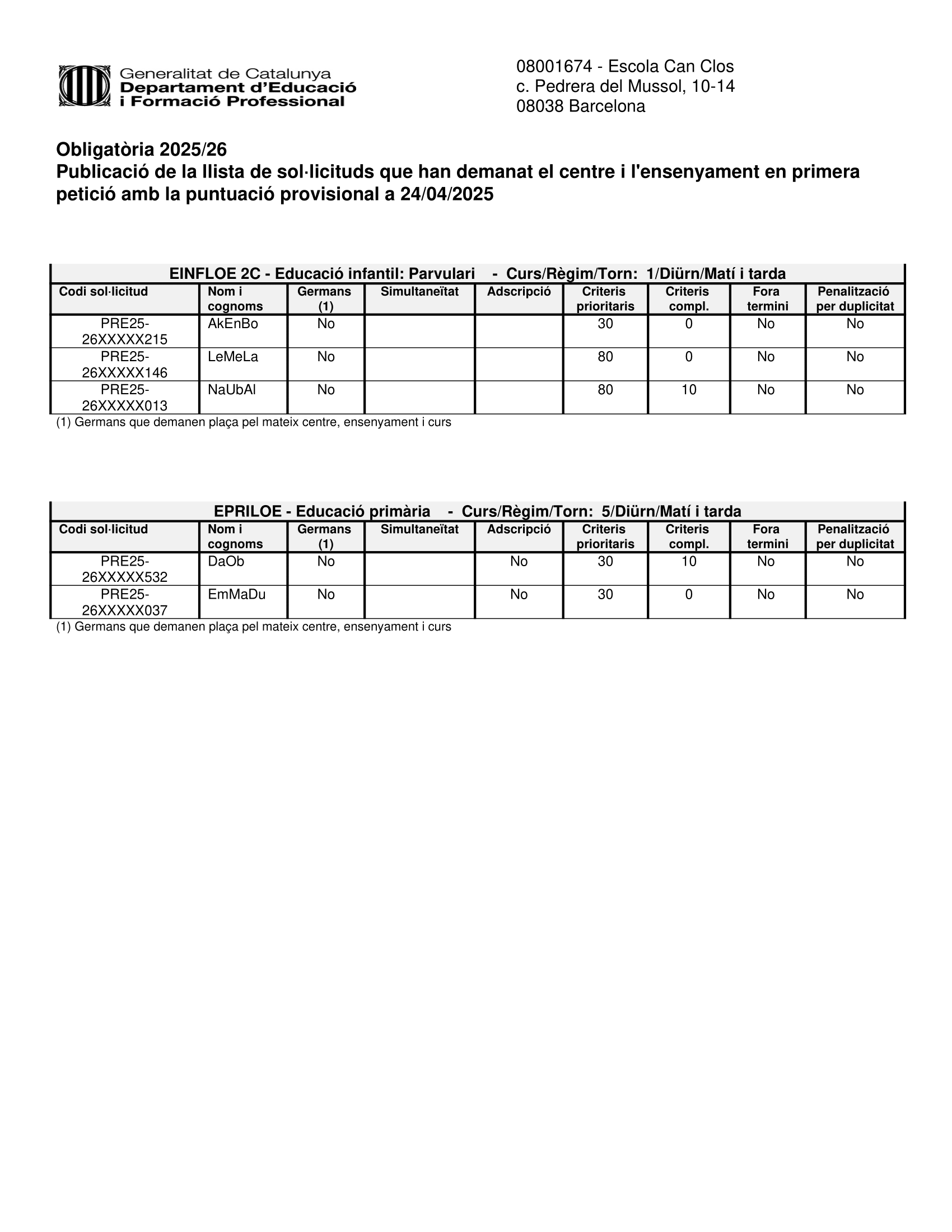 PUBLICACIÓ BAREM PROVISIONAL Feu un comentari / Per admin / 24 d'abril de 2025 / General Portada Famílies! S’ha publicat el barem provisional per a la preinscripció del curs 2025-2026 i s’inicia el període de reclamacions del 24 al 29 d’abril.