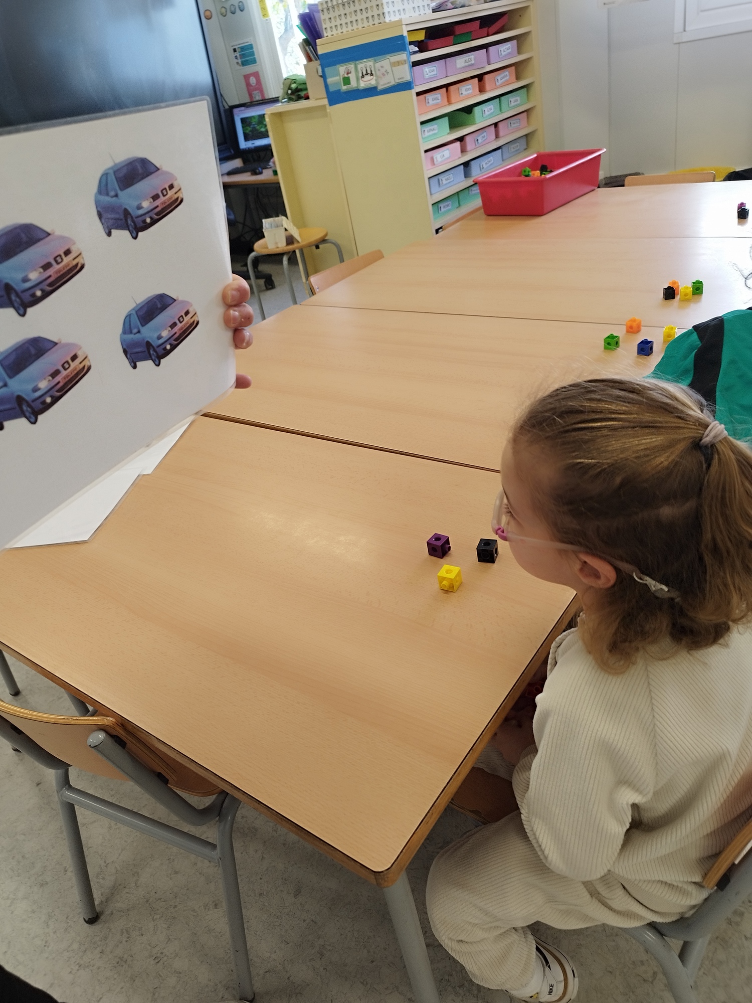 • Atenció i memòria visual: En mostrar les flashcards, els infants han de recordar les combinacions i relacionar-les amb altres representacions (com les torres de policubs). També utilitzem jocs de memòria on han de recordar quina targeta estava associada a un número determinat o identificar una seqüència de blocs després de veure-la breument.