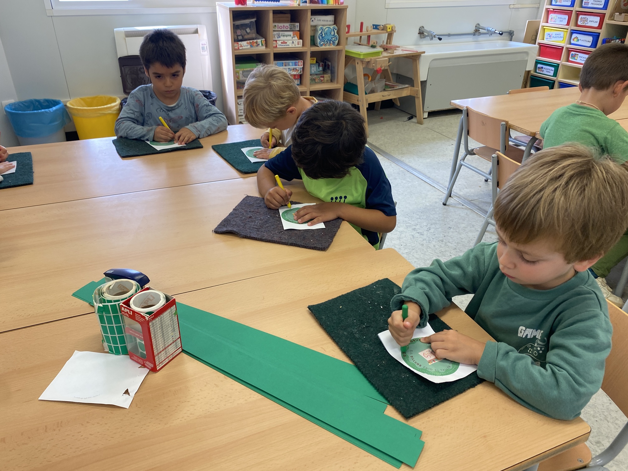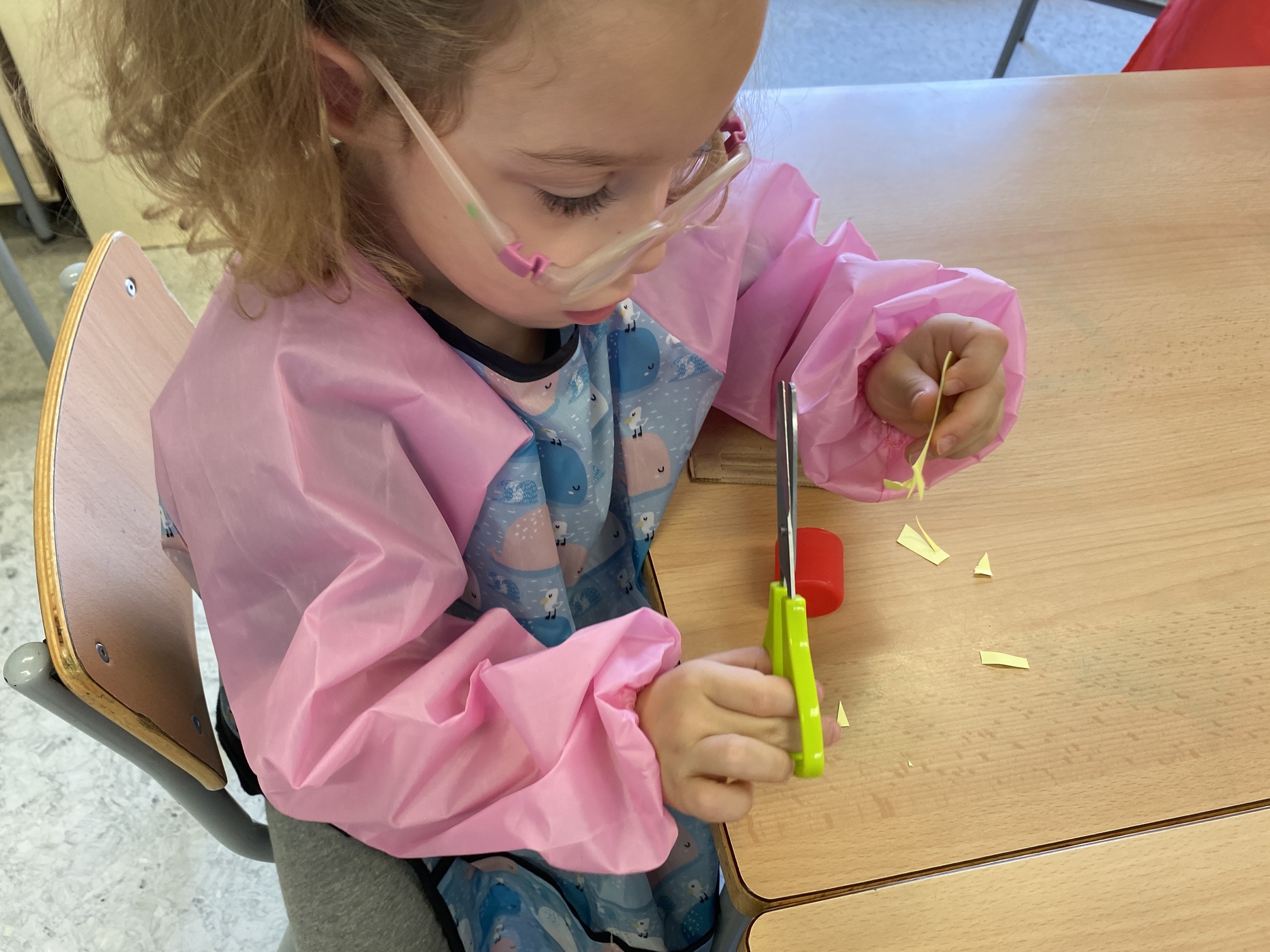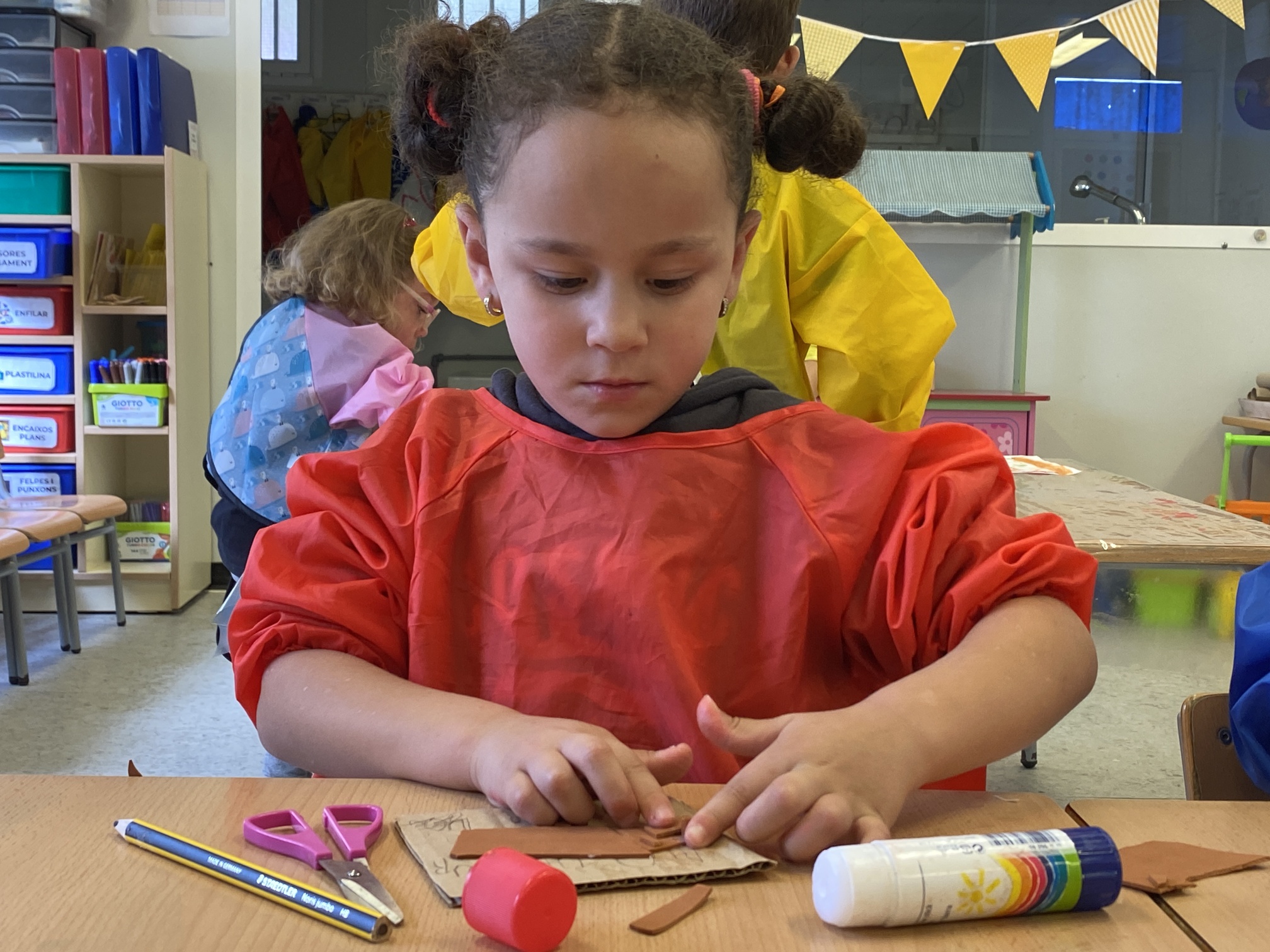 • Aprenentatge de l’ús de les tisores i la pega: Aprendre a utilitzar les tisores de manera segura és una habilitat essencial en aquestes edats, que alhora potencia la coordinació mà-ull i la concentració. També fem un treball del bon ús d’aquest estri, què podem retallar (paper, cartolina, cartó…) i què no podem tallar (roba, cabells, boca, dits…).