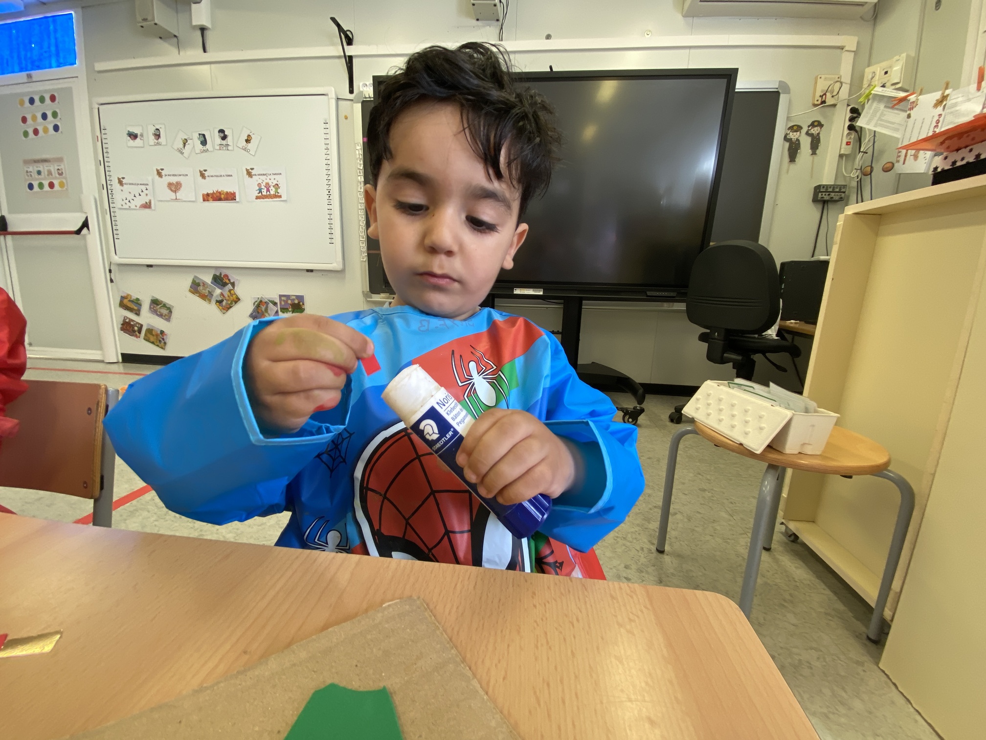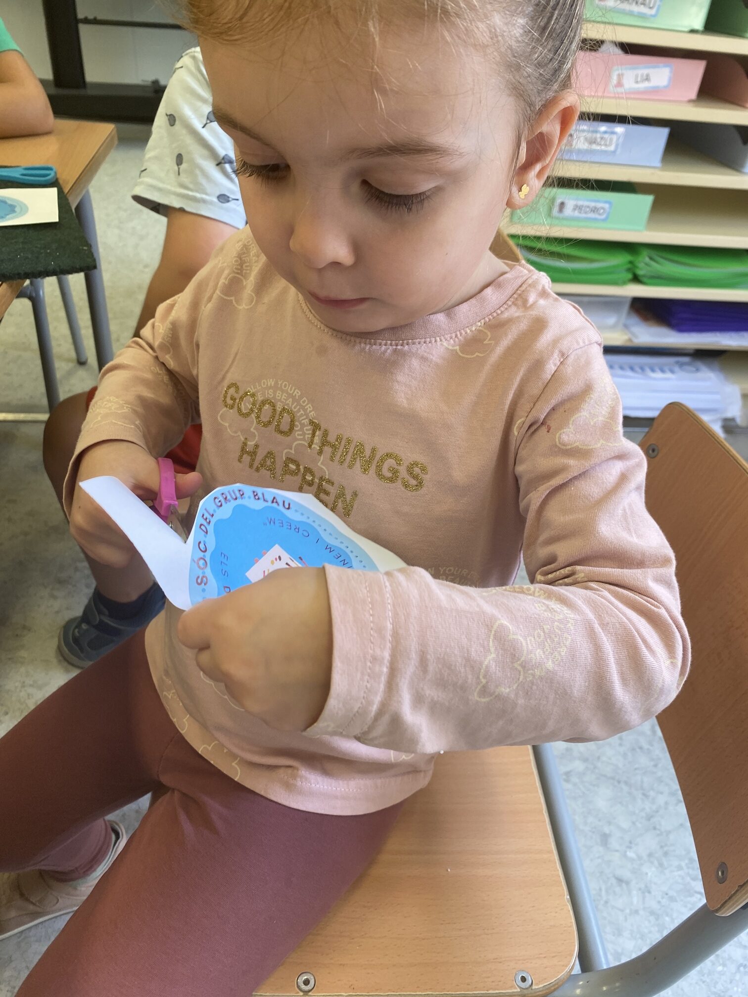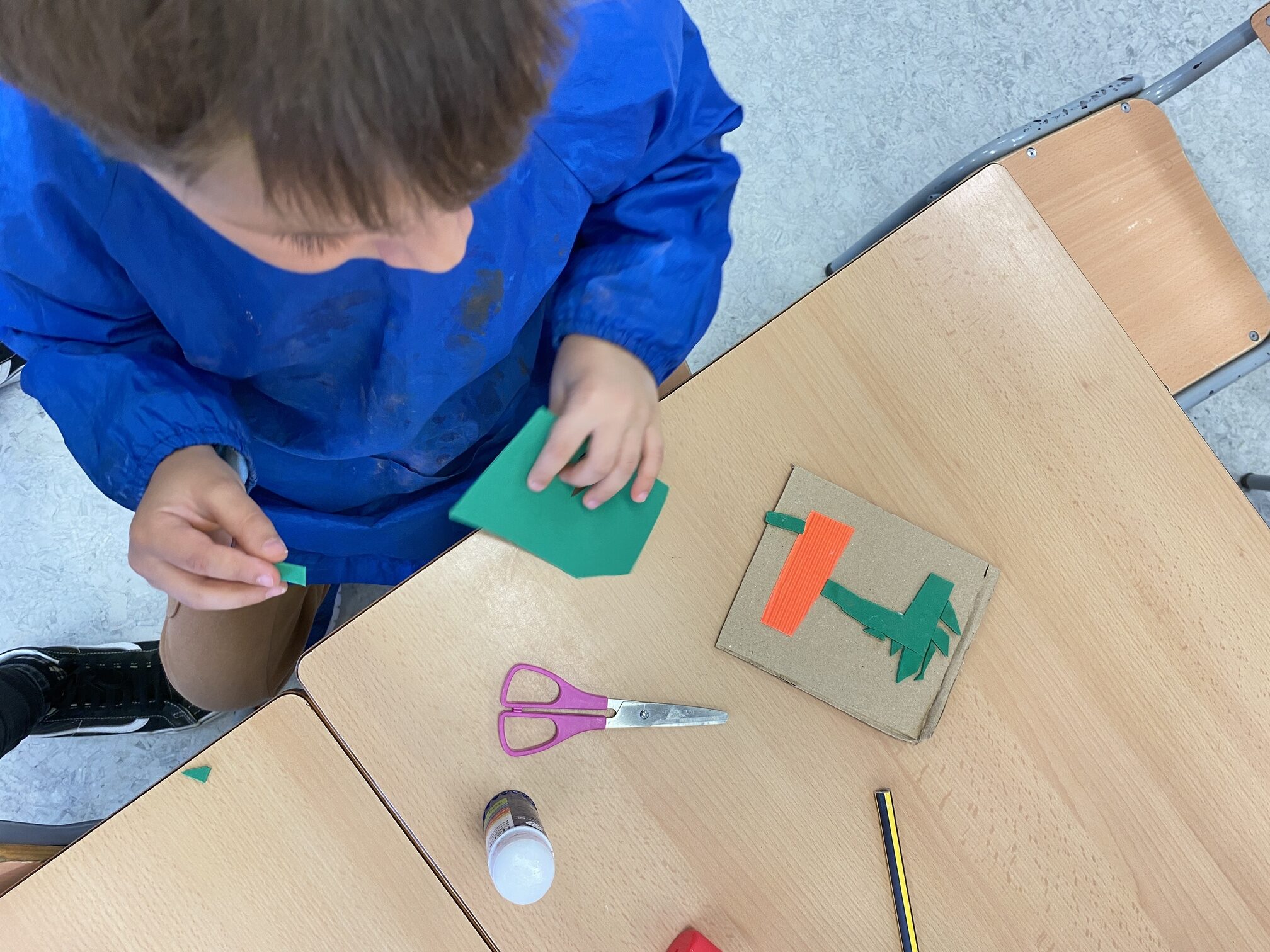• Aprenentatge de l’ús de les tisores i la pega: Aprendre a utilitzar les tisores de manera segura és una habilitat essencial en aquestes edats, que alhora potencia la coordinació mà-ull i la concentració. També fem un treball del bon ús d’aquest estri, què podem retallar (paper, cartolina, cartó…) i què no podem tallar (roba, cabells, boca, dits…).