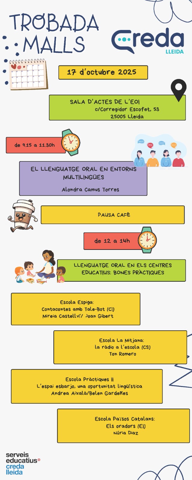 El passat divendres 17 d’octubre, l’Escola ESPIGA de Lleida va participar en la Trobada de MALLs (Mestres d’Audició i Llenguatge) organitzada pel CREDA de Lleida. La trobada va tenir lloc a la sala d’actes de l’Institut Joan Oró, un espai que va acollir professionals de diferents centres educatius de la demarcació.