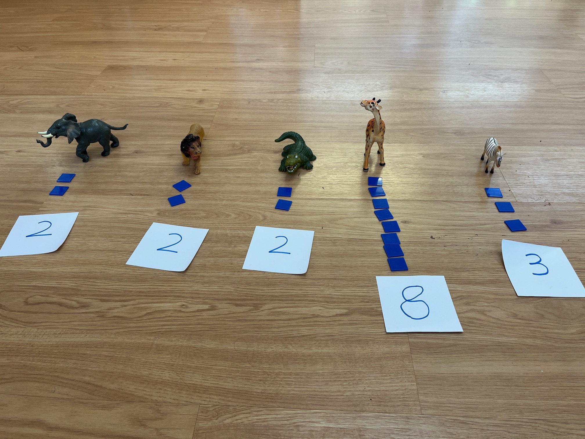 Ara amb els deures fets, tothom a la rotllana ha dit quin animal ha pensat, hem retirat els altres i hem votat l’animal que més ens agrada posant-li una peça blava al costat. Hem comptat totes les peces (vots) de cada animal i el resultat ha estat: