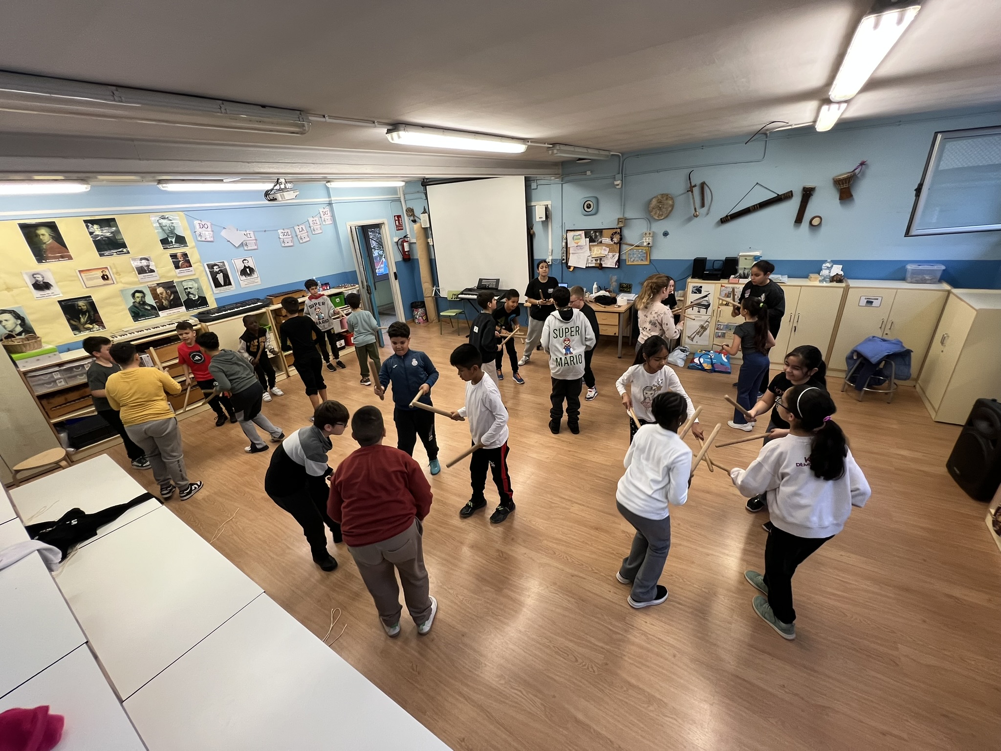 Després de l’explicació, ens va repartir els bastons i vam començar a practicar els passos. Al principi ho vam fer sense música, perquè poguéssim aprendre els moviments amb calma i entendre bé què havíem de fer. A poc a poc vam anar practicant i vam anar unint els diferents passos fins a tenir tota la seqüència clara.