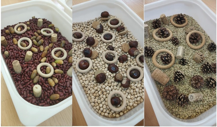 Entre tots els nens i nenes de la classe dels i les policies hem creat petits espais de manipulació amb diferents elements. Vam afegir llegums com per exemple, cigrons, llenties o mongetes. A més, vam decidir que hi podriem incorporar altres elements de la tardor com les castanyes, aglans o pinyes.