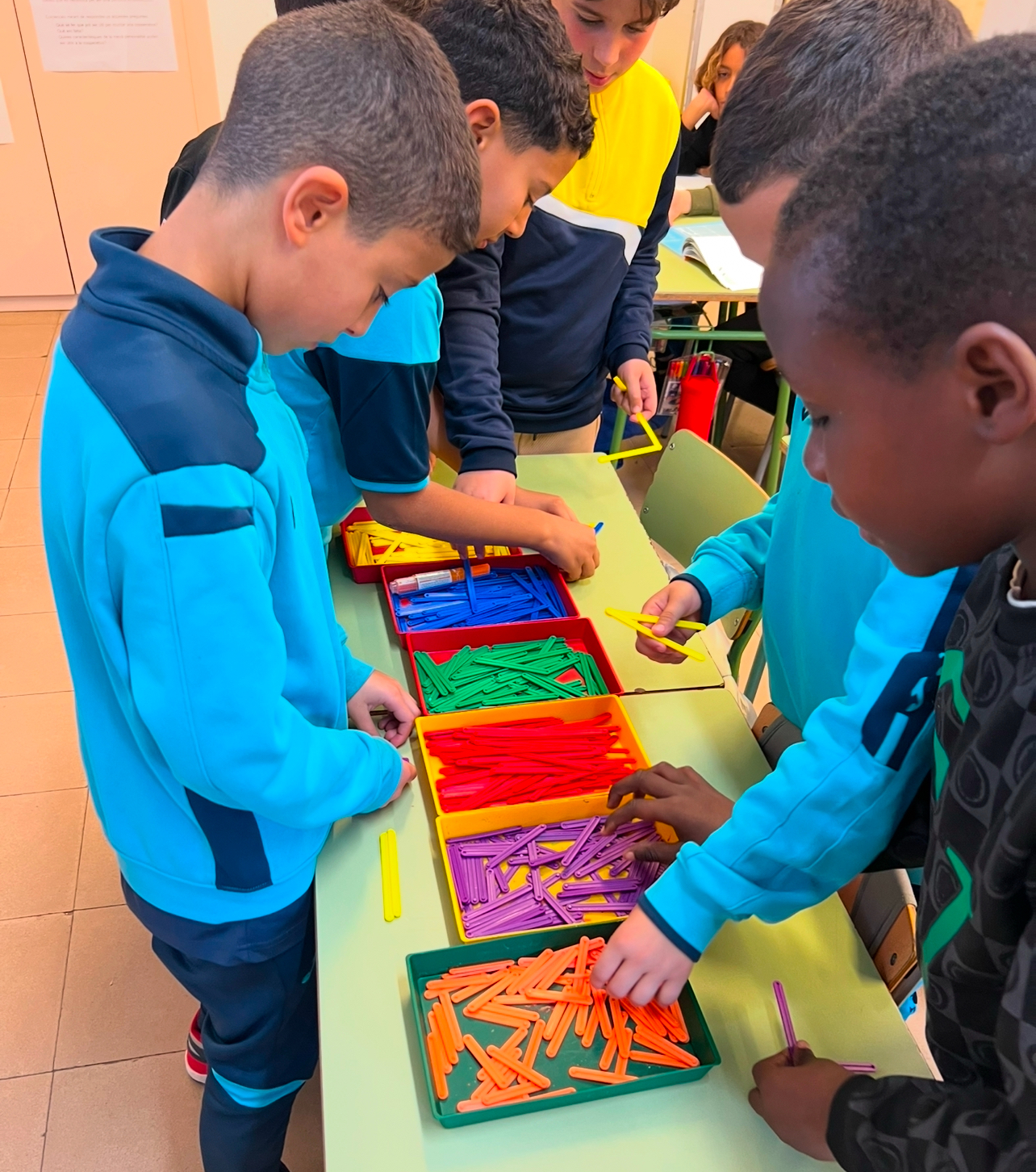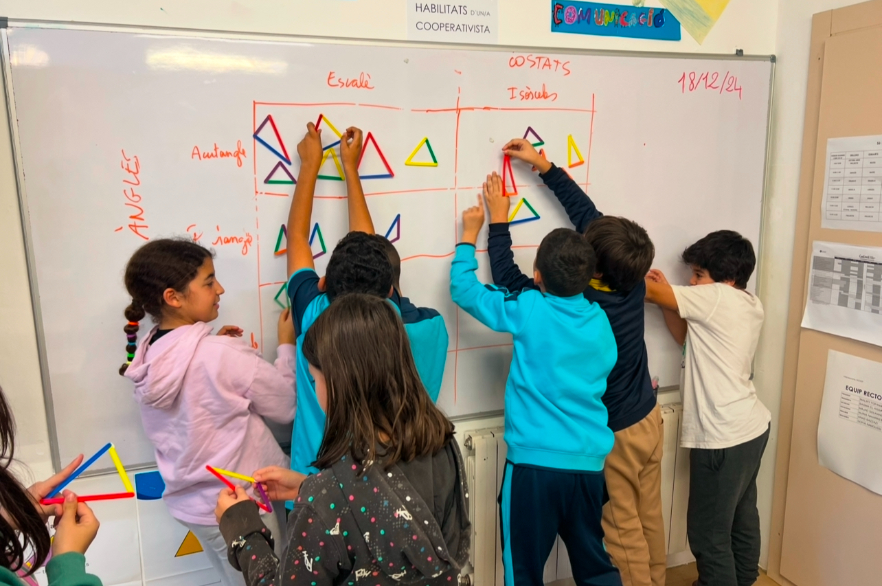 En aquesta sessió d´Innovamat, els infants de 5è, hem construït diversos triangles, descobert algunes propietats i els hem classificat. Per realitzar aquesta missió hem comparat els triangles segons diversos criteris geomètrics, hem utilitzat el transportador d’angles per mesurar angles i hem investigat amb segments de longituds diverses. Us deixem algunes fotos del procés.