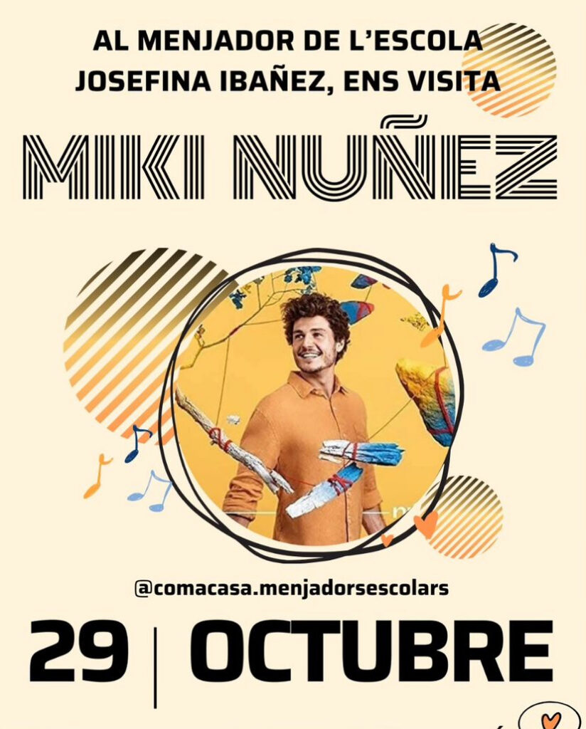 Com a Casa Menjadors Escolars ens vol compartir la il·lusió d’un projecte del qual forma part: “Bo, Sa, d’Aquí: Mengem bo, fem música, som escola”, per això el dia 29 D’OCTUBRE, rebrem la visita de “MIKI NUÑEZ” al menjador de l’escola!!