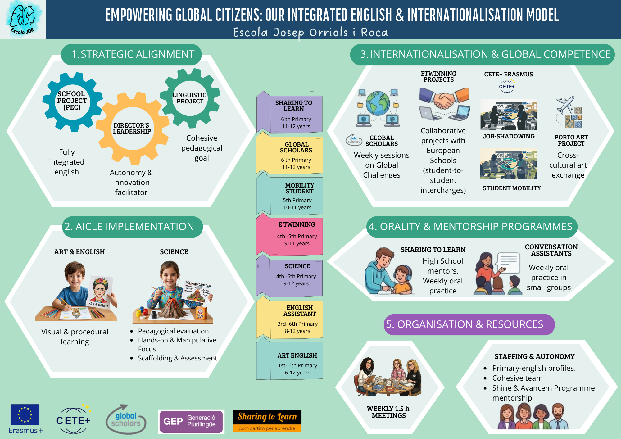 Per això, hem construït un model propi que integra l’anglès dins del nostre dia a dia a l’escola, de manera natural, significativa i connectada amb el nostre projecte educatiu. A continuació us compartim una infografia que recull, de manera visual, totes les línies d’actuació, programes i activitats que desenvolupem: