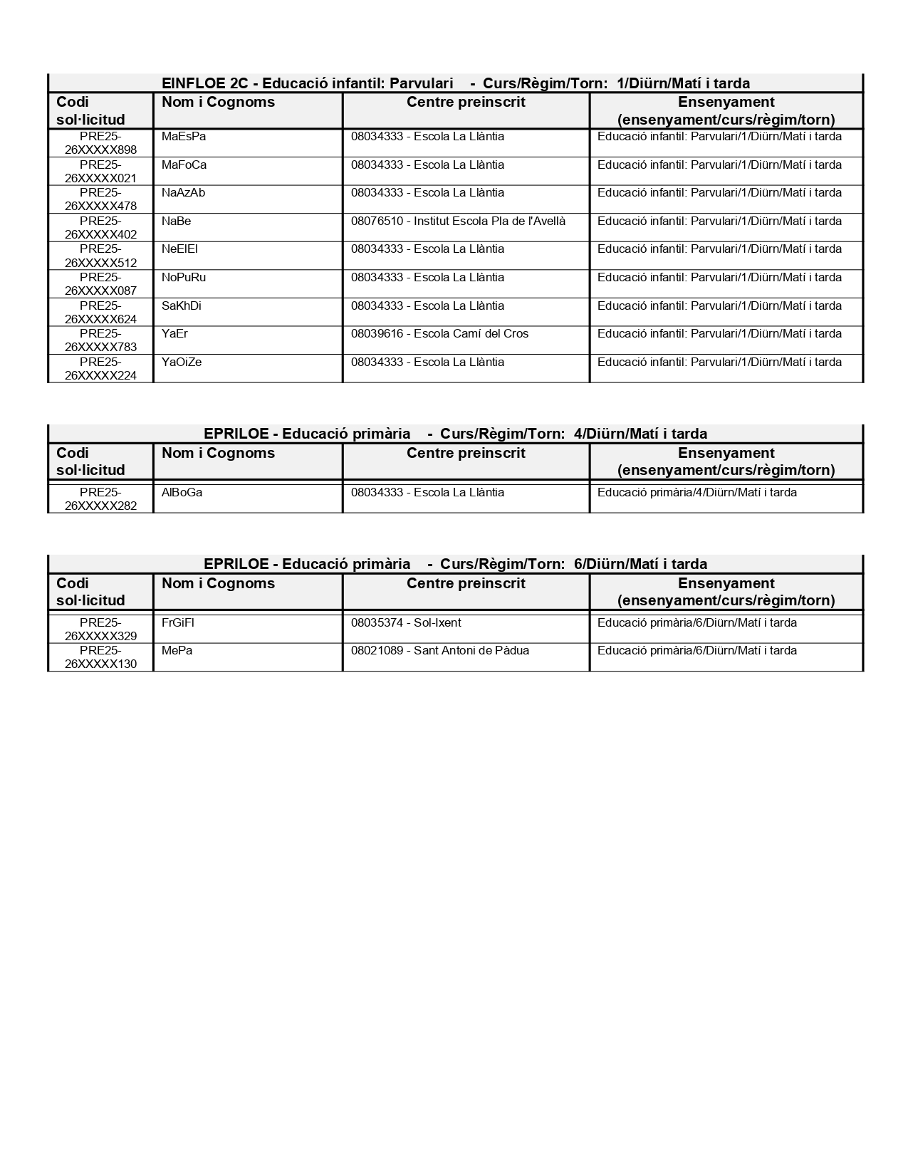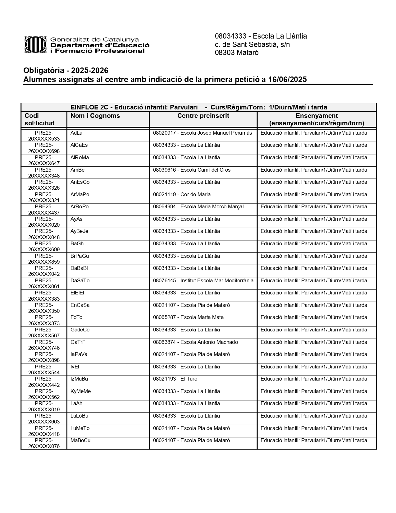 Alumnes assignats al centre amb indicació de la primera petició.
