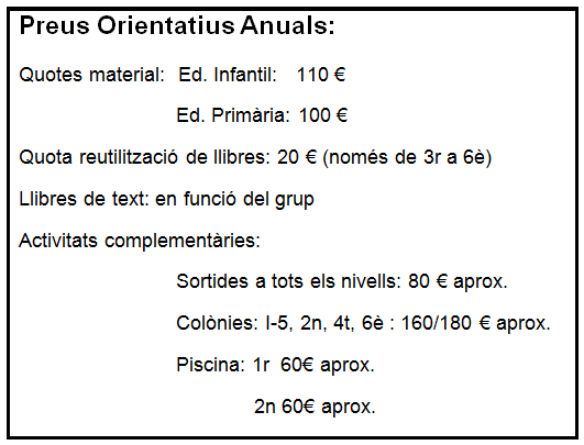 Descripció i enumeració del material escolar que els alumnes i famílies necessitaran per al nivell educatiu corresponent, és recomanable diferenciar les diferents tipologies de material escolar necessari (llibres de text, lectures, dispositius digitals, material de taller, de dibuix…).