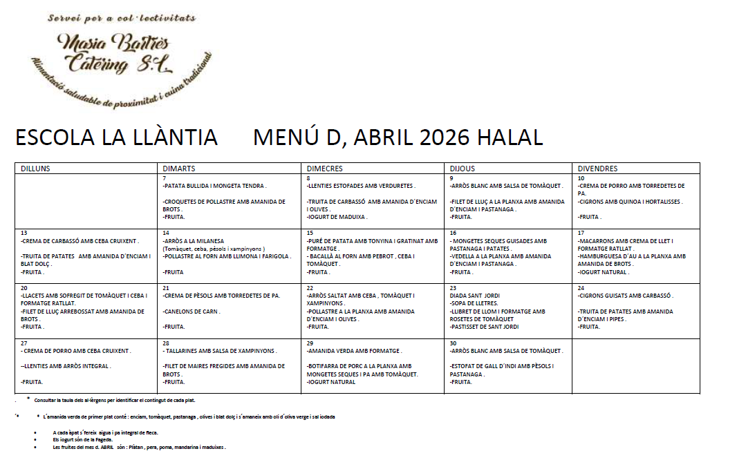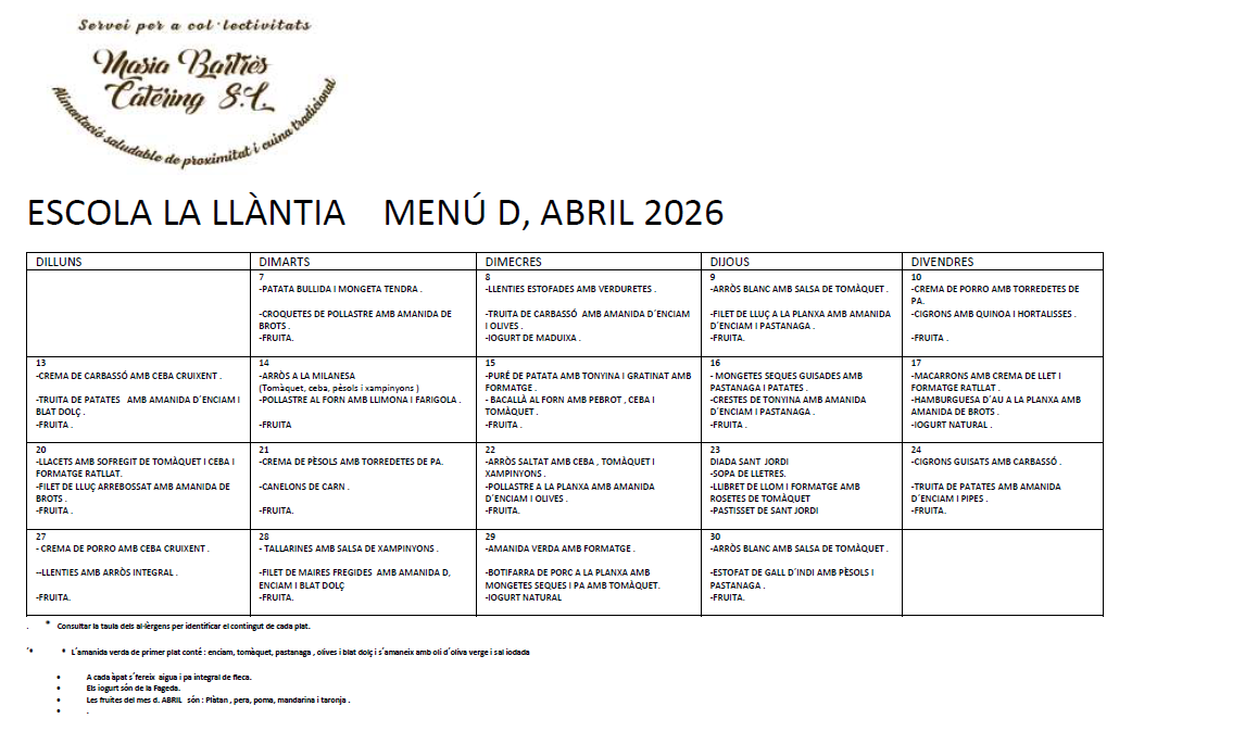 L’empresa Enlleura’t és qui gestiona el servei de menjador i lleure del migdia, entre les 12:30h i les 15h.