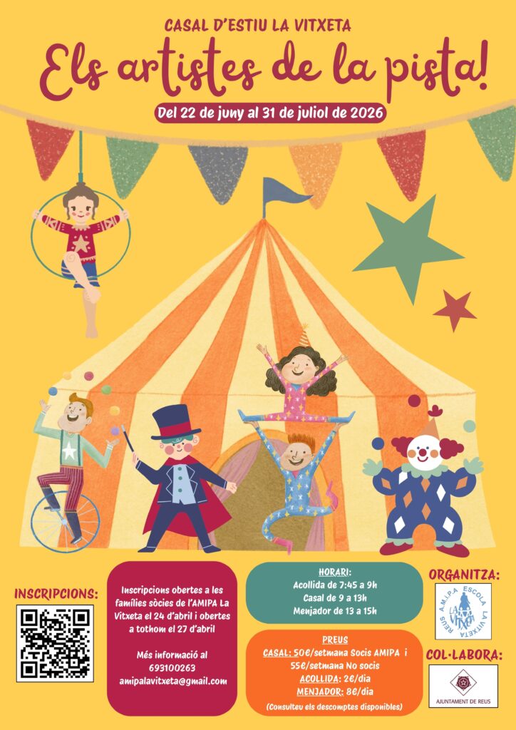 Aquest estiu al Casal de La Vitxeta ens endinsarem en el món del circ i les seves modalitats. Formarem una gran família, portarem arreu l’alegria i treurem l’artista que portem a dins. Farem que aflorin les nostres habilitats i la nostra creativitat. Que comenci l’espectacle! Veniu a formar-ne part!”