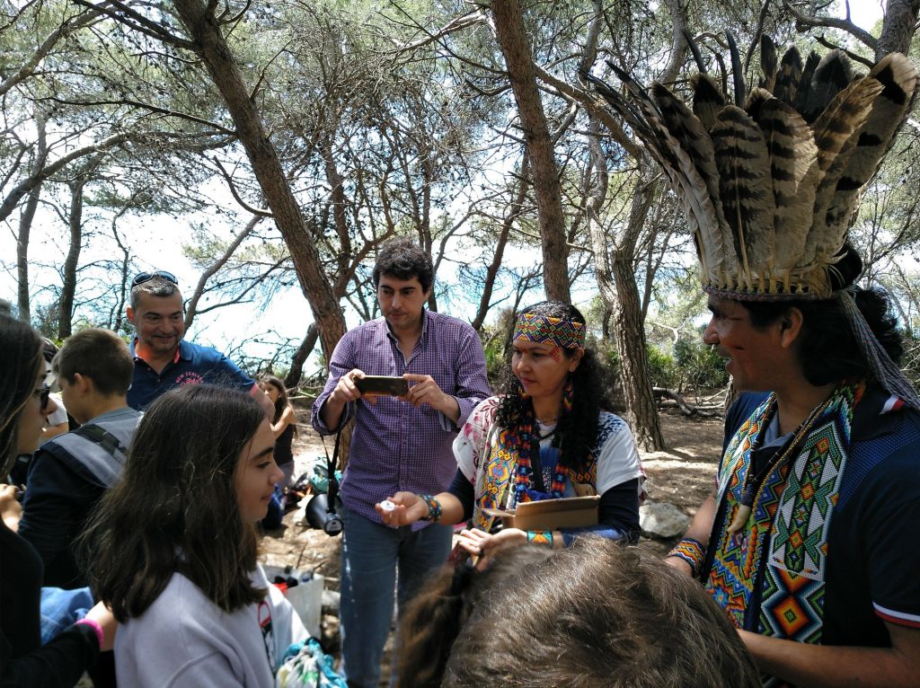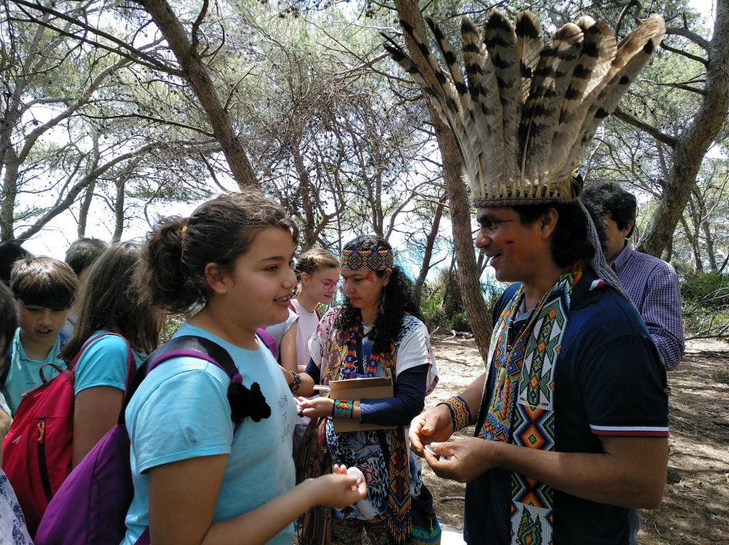 Ens hem trobat al Bosc de la Marquesa, un entorn molt especial per acollir aquestes dues persones vingudes de l’altra punta de món per conèixer-nos i passar una estona amb nosaltres. Les tres escoles que formem part d’aquest projecte: l’escola la Canaleta de Vila-Seca, l’escola Guillem de Claramunt de la Secuita i la Vitxeta ens hem trobat a la platja de la punta de la Mora. Hem estat els primers, els nens i nenes no han pogut resistir la temptació de fer els primers banys de peus i saltar i córrer per la sorra. Al cap d’uns minuts han arribat el Puwe i la Vari amb els seus collars que impressionen i la seva corona de plomes imponent, que deixava els nens i nenes bocabadats. Els vitxets, espontanis com són, no han trigat a acostar-se i a fer algunes preguntes. Al ser els primers han gaudit del privilegi de parlar una estona amb ells. Tot i que parlen portugués, l’idioma no ha estat cap problema, l’Adolf (de l’ONG Guardians de l’Amazònia) ens ha fet de traductor quan ha fet falta.