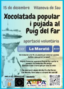 Amb motiu de la Marató, l’AMPA ha organitzat una xocolatada popular i una pujada al Puig del Far. Des de l’escola, hem elaborat una pancarta per animar a tothom a col·laborar i recaptar fons que es destinaran a la Marató d’aquest any, dedicada a les malalties respiratòries. A més, aprofitant que els alumnes de 5è i 6è estem estudiant el cos humà, vam convidar la Lídia, una infermera de l’Hospital Trueta, per fer una xerrada i explicar-nos com funciona aquesta part del nostre cos.