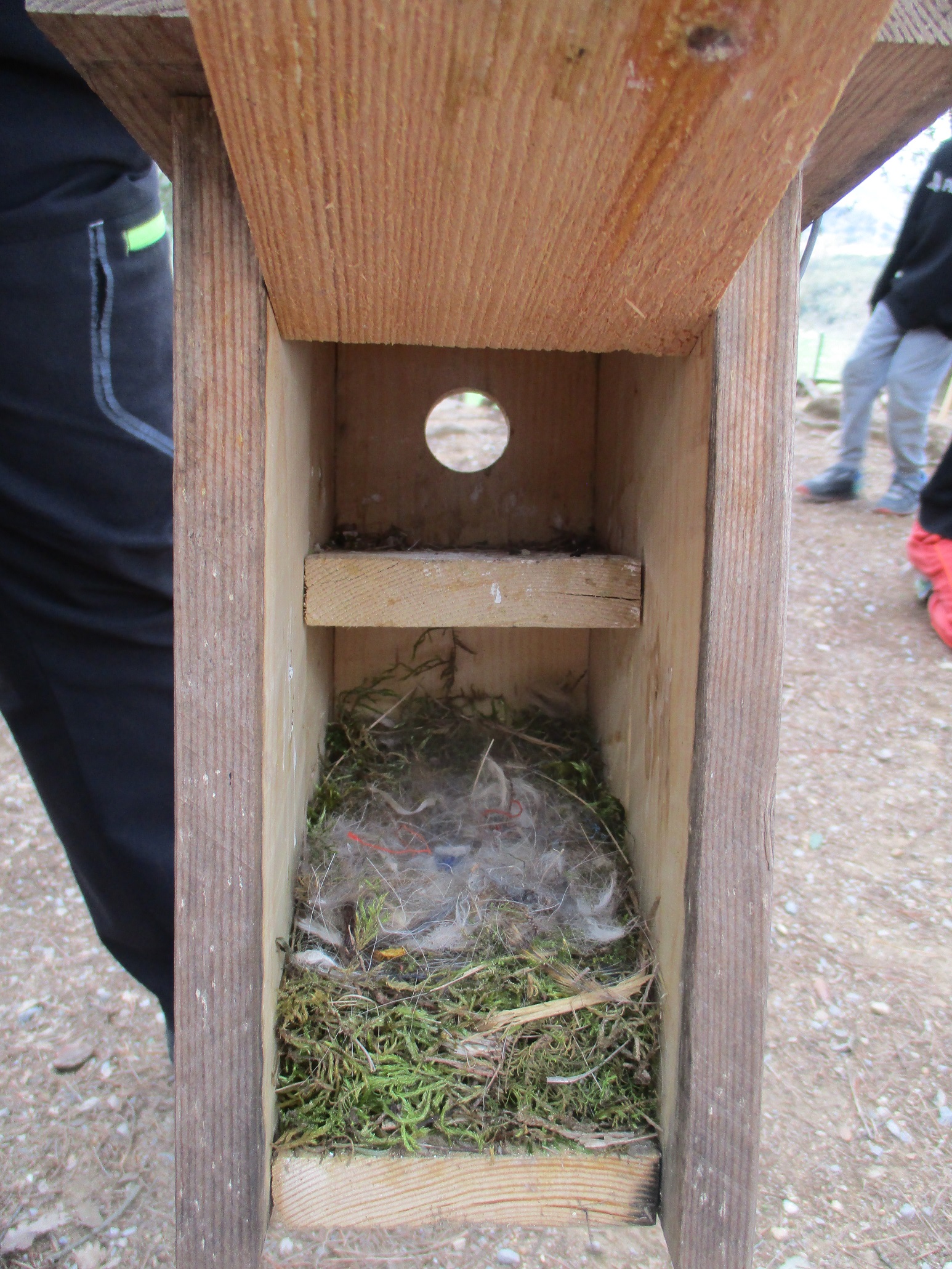 Hem vist que hi ha niu a 4 caixes. Els nius són diferents: n’hi ha que tenen plomes i n’hi ha que no. N’hi ha que són més alts que els altres. N’hi ha que són marrons i d’altres també tenen color verd perquè hi han posat herbes o molsa.