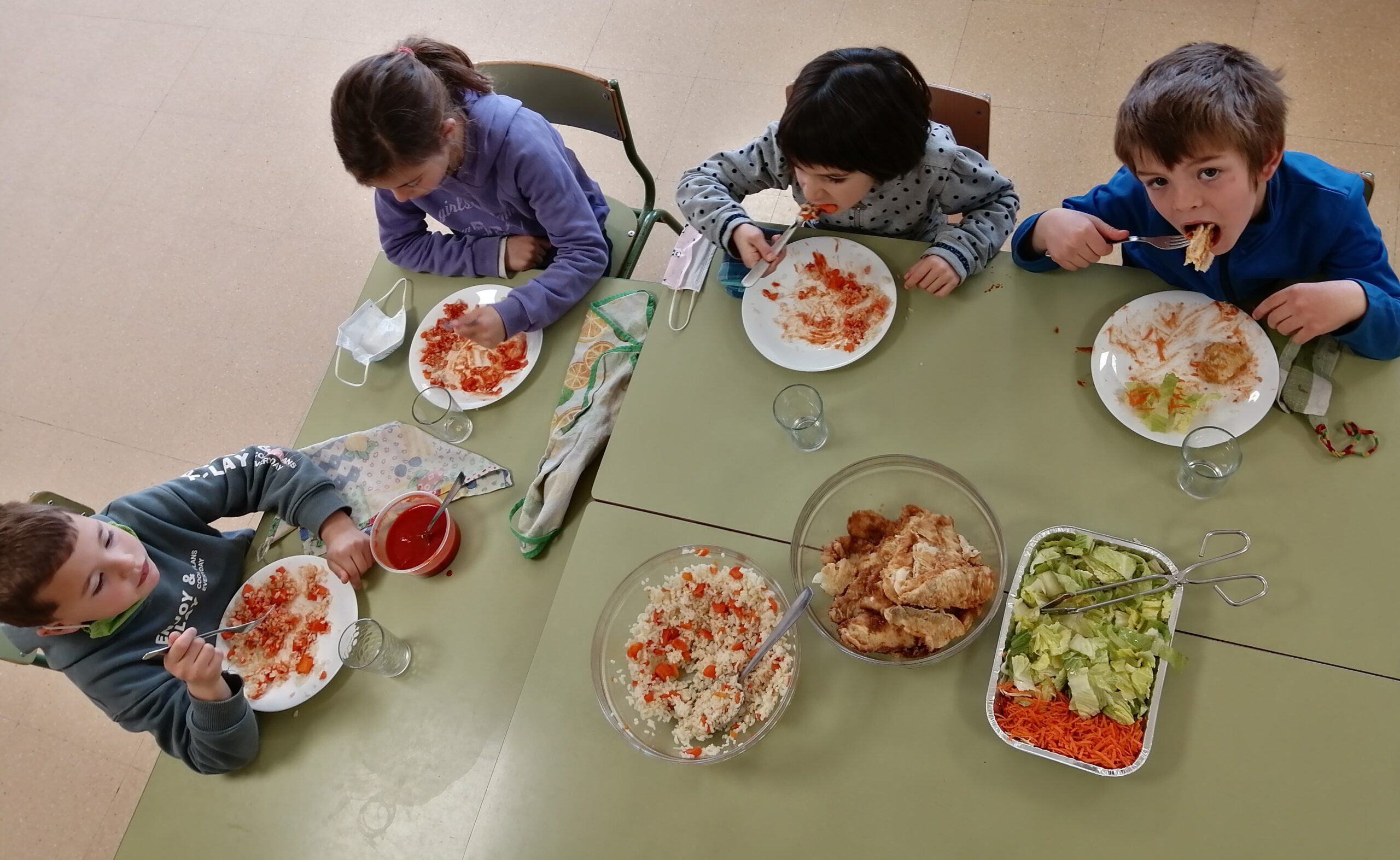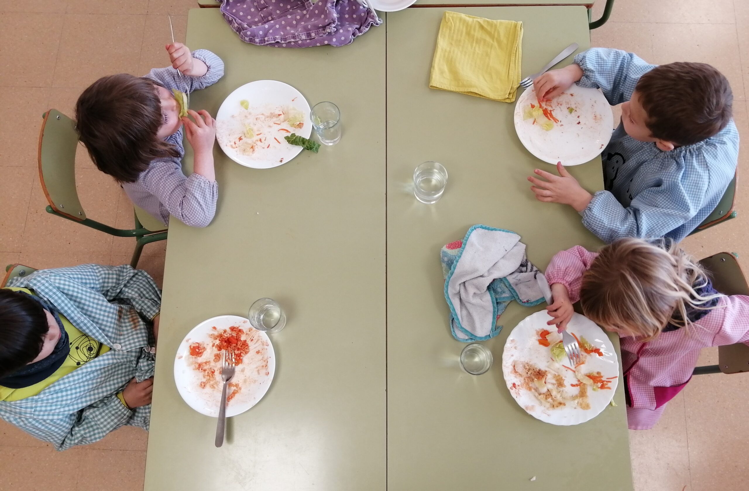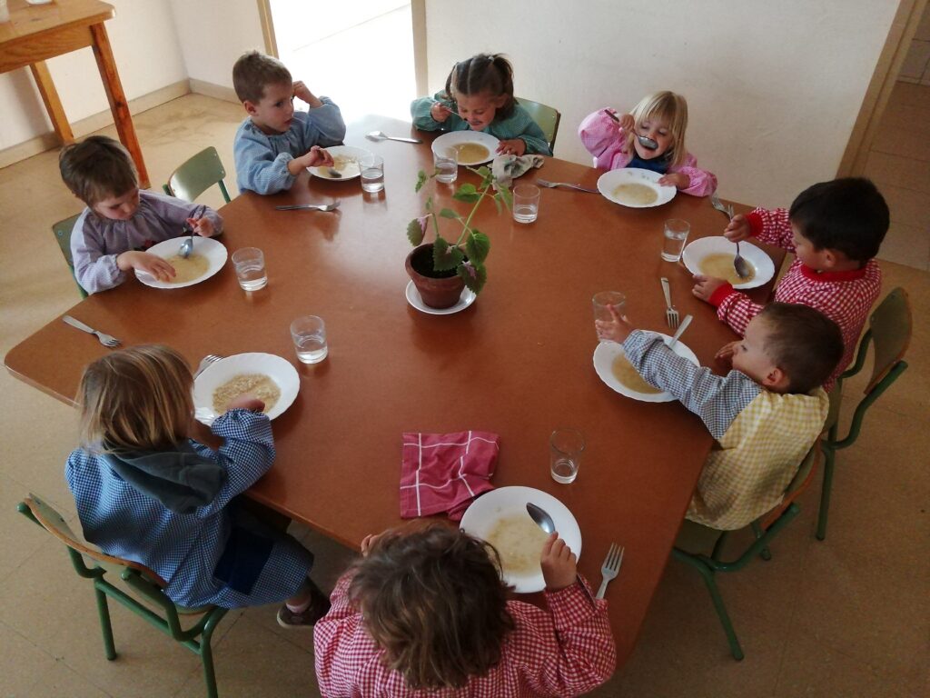 La persona adulta va repartint el menjar establint una pacte ( hi ha d’haver un mínim raonable) sobre la quantitat que es comprometen a menjar-se. Si volen repetir del primer plat, abans han de menjar-se el segon. Mica en mica van introduint l’ús del ganivet per part dels infants segons les habilitats motrius fines i la destresa que mostrin.