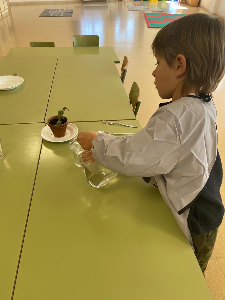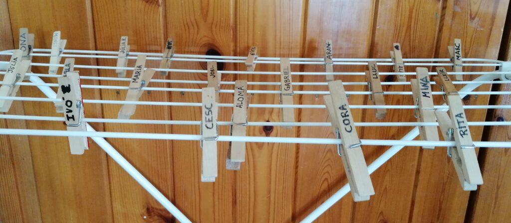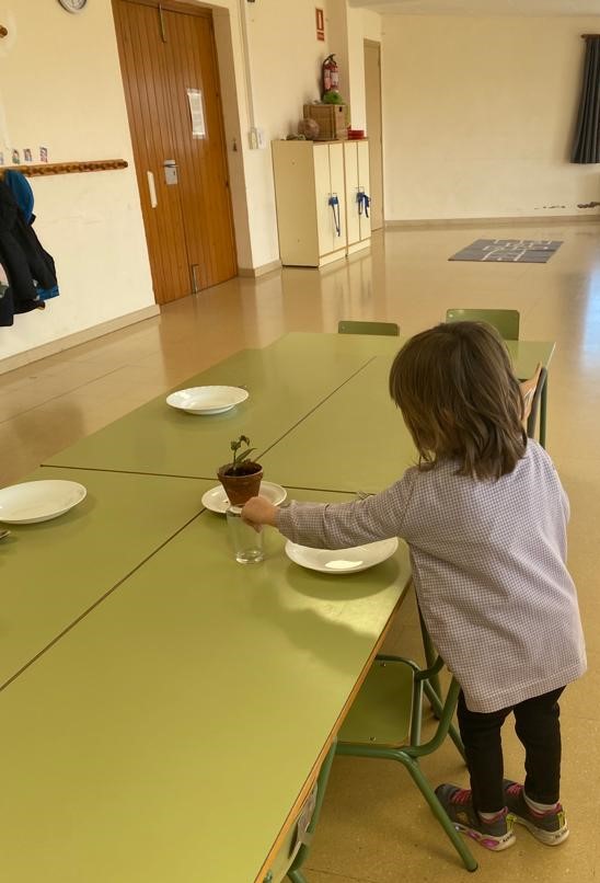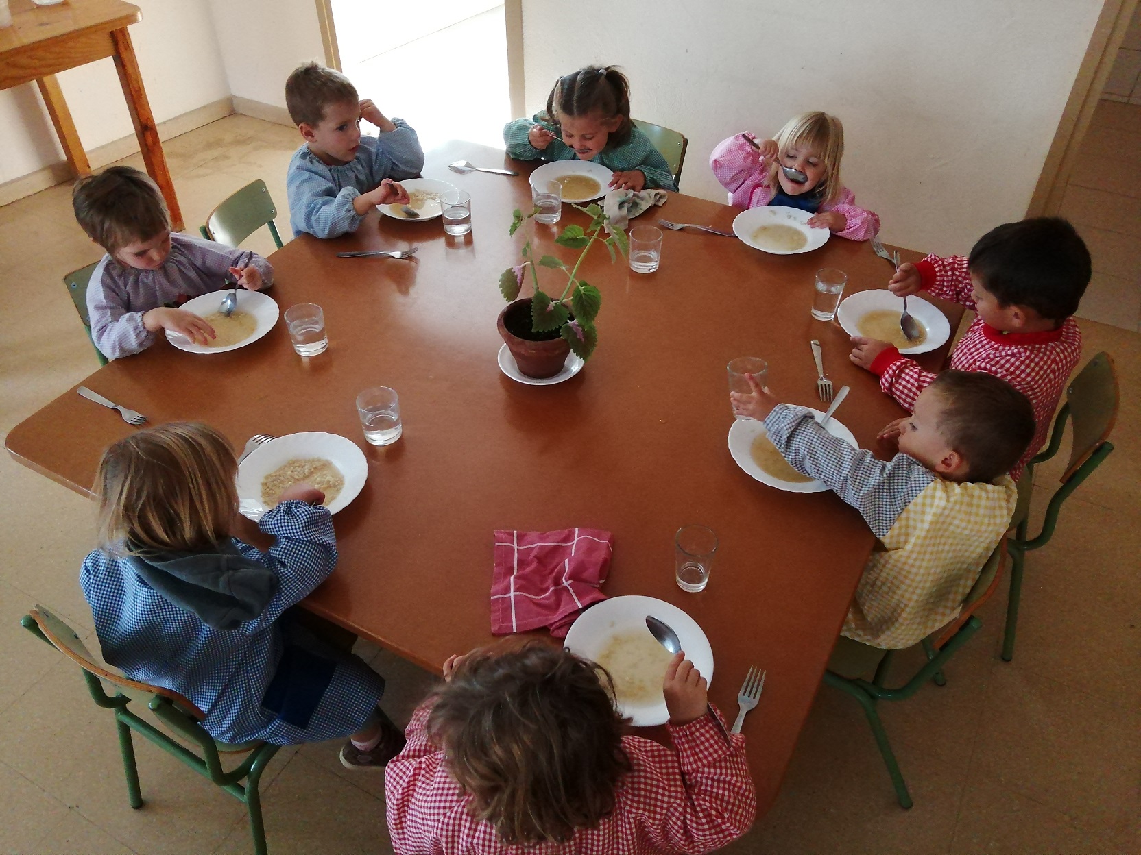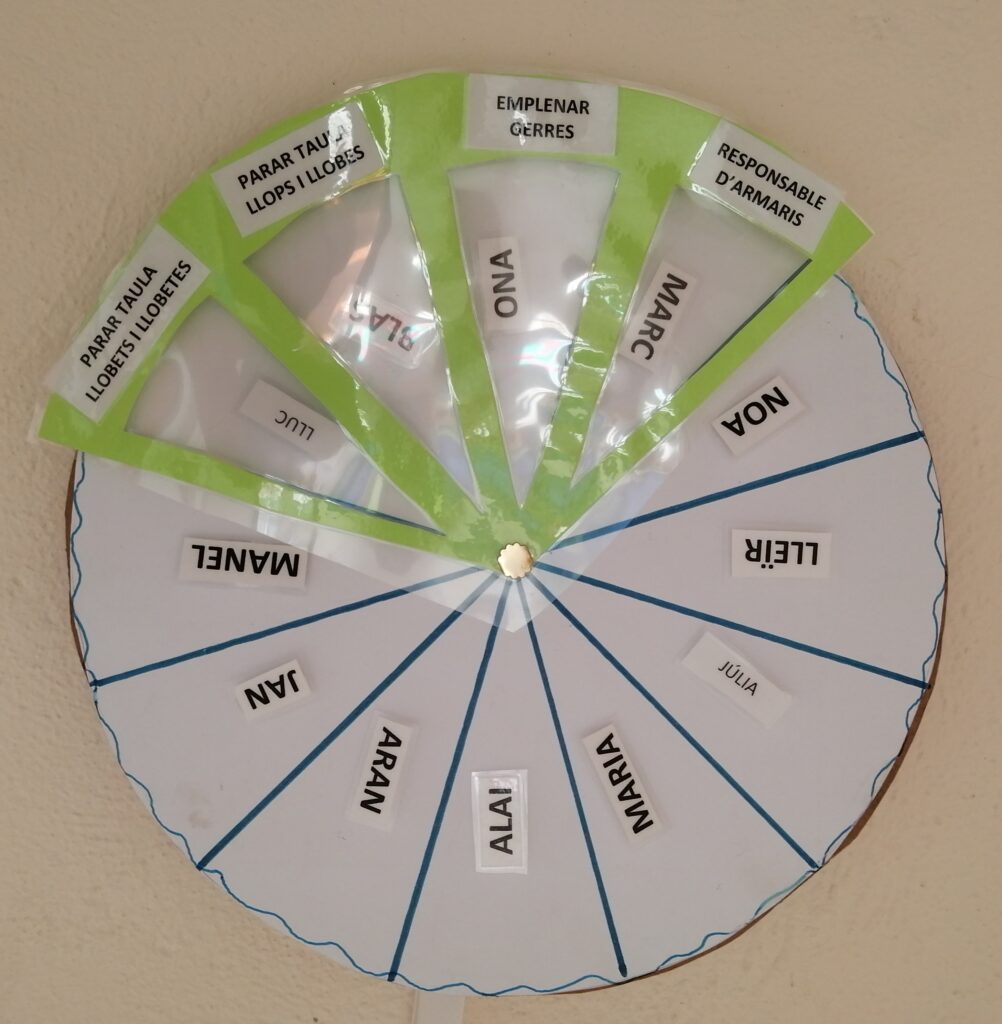 En aquest moment 3 infants del grup entren amb una d’elles al menjador per anar parant les taules i la resta es queden a jugar en la pista amb l’altra persona adulta. El primer que fan és posar-se la bata i rentar-se les mans. Després van repartint els gots, per posar l’aigua i distribuint els coberts i els plats al lloc corresponent. Agafen el seu tovalló de roba i van avisar als altres infants que ja poden entrar i fer la rutina pertinent. Cadascú té assignat un lloc que va canviant cada cert temps segons la dinàmica que millor afavoreix un bon clima de convivència.