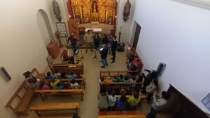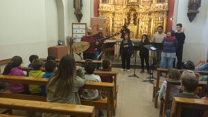 Un cop vam haver acabat el taller, vam entrar a l’església on el grup Noc i la resta de noies de Tornaveus, juntament amb en Jeremy (tiorba) i el Joel (violí), ens van fer partíceps del seu assaig pel concert que faran al festival d’Espurnes Barroques el dia 2 de juny a l’església de Matamargó. Vam gaudir de les seves veus, acompanyades pels instruments i per uns moments ens vam deixar emportar per la màgia de les polifonies que generaven aquelles melodies. Vam acabar cantant l’Antònia amb tots ells i elles, fent i escoltant les diferents veus i creant un moment realment màgic.