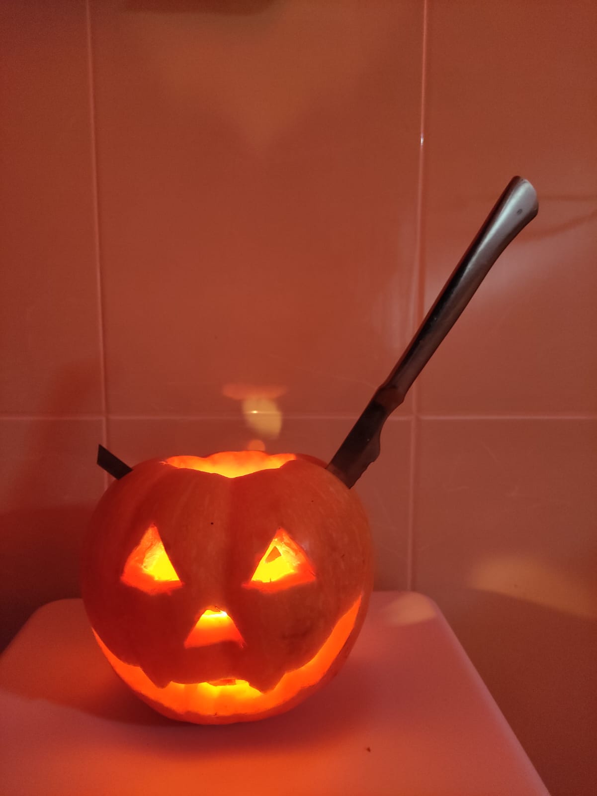 La carbassa és molt original, té uns ulls i un nas triangulars, la boca semblant a un vampir, com que es va trencar la fulla del cúter la van clavar i també van clavar un ganivet.