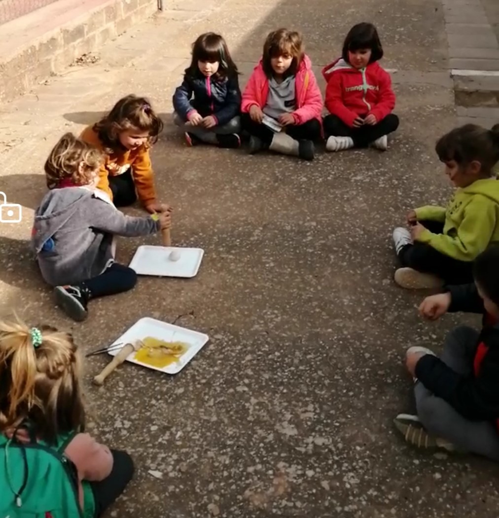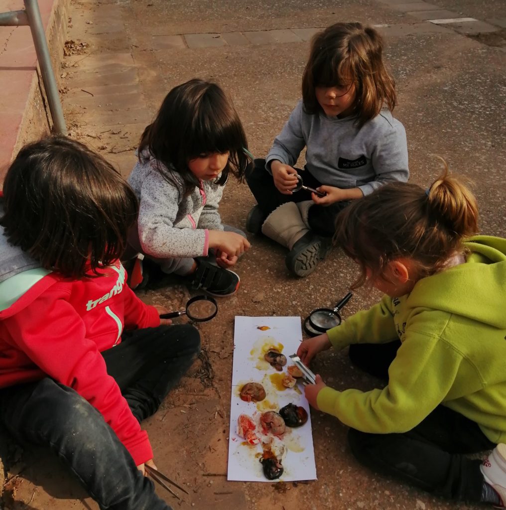 El cicle de la Vida també acull la mort i els pollets no nascuts també van generar curiositat de manera natural i espontània. Vam sortir a l’exterior amb uns 12 ous de pollets no nascuts i 1 ou d’aigua, una mà de morter, unes safates de plàstic, unes lupes i unes pinces. Els infants, uns des de molt a prop i uns altres des de la finestra, van poder comprovar les diferents fases en les que s’havien quedat els ous amb pollet i l’ou d’aigua. «S’està formant una miqueta.» «Potser estava a punt de néixer i com l’endemà el vam moure…» «Com un ou ferrat!» «A vegades es moren amb un ull obert… Una cabra ‘marrona’ que era la meva estimada es va morir així.» «Cóm és que els ous de gallina de color blanc han sigut morts més grans?»
