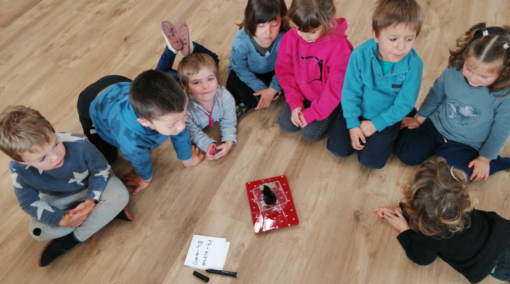 El dijous engeguem el matí fent hipòtesis sobre quin dels dos pollets pesarà més. A primera vista la majoria opinen que el Guapo és una mica més gran. És el primer dia que els traiem de la caixa i, amb peces de construcció, els hi fem unes places ben boniques per poder observar-los de més a prop. Primer juguem amb una balança tipus romana per comprovar si el que a priori pensàvem era cert. I a l’endemà fem servir una balança electrònica de cuina per conèixer el pes exacte de cadascú. El resultat va ser aquest: amb un pes ploma de 43 grams, el Guapo; i amb un pes ploma de 41 grams, la Boleta.