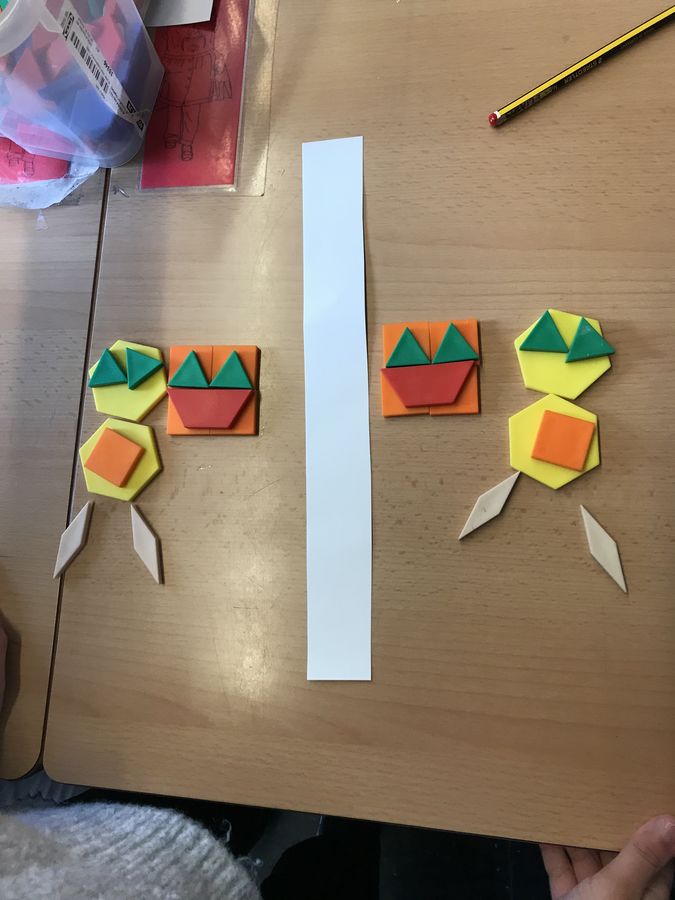 Els alumnes de segon hem estat buscant per la classe, amb l’ajuda d’uns miralls individuals, quins objectes del nostre entorn més proper són simètrics. N’hem trobat una pila! També hem jugat amb els Pattern blocs i hem creat diferents figures, fent-ne a la vegada una altra de simètrica. D’aquesta manera, podem apropar-nos a la comprensió del concepte de simetria.