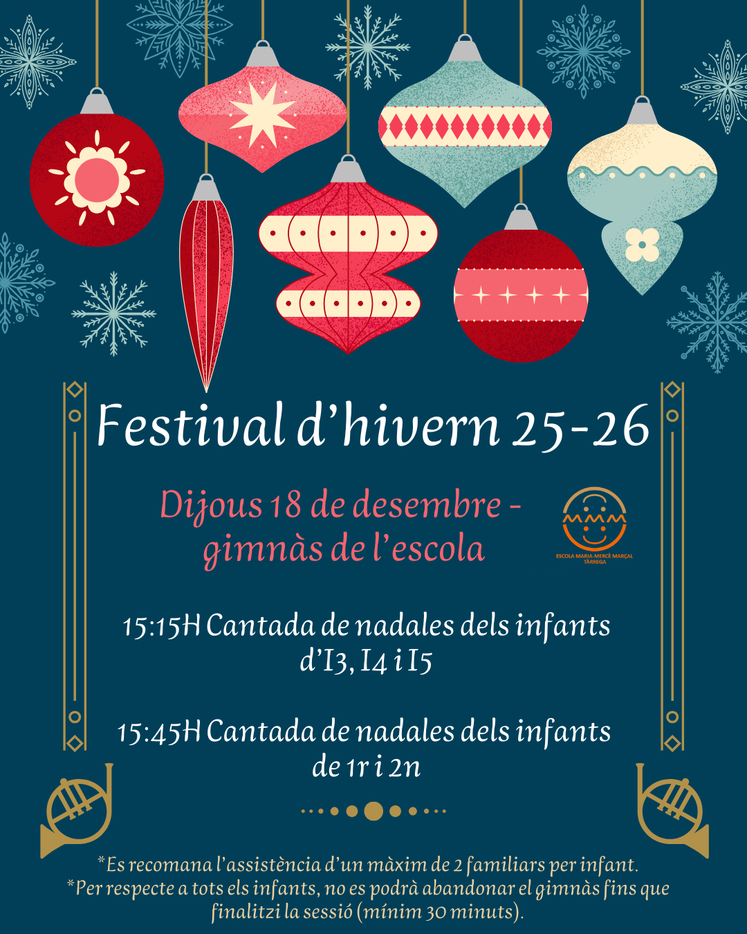 El proper dijous 18 de desembre tindrà lloc la tradicional cantada de nadales a l’escola. Els infants d’educació infantil (I3, I4 i I5) i cicle inicial (1r i 2n) ens oferiran un recull de nadales i poemes al gimnàs de l’escola. L’acte és obert a les famílies, es recomana l’assistència d’un màxim de 2 familiars […]