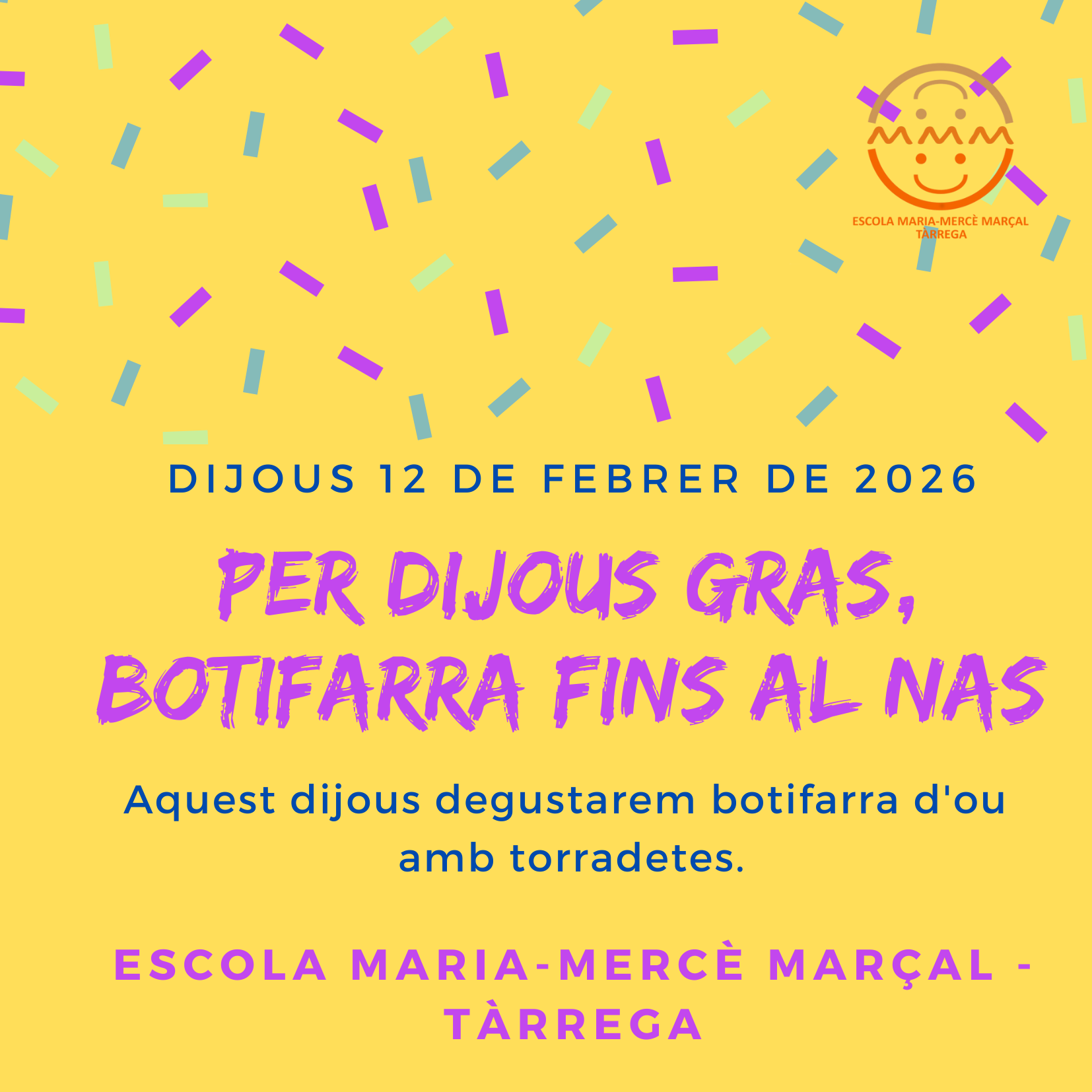 Aquest divendres 13 de febrer celebrarem Dijous Gras a l’escola. Menjarem botifarra d’ou amb torradetes.