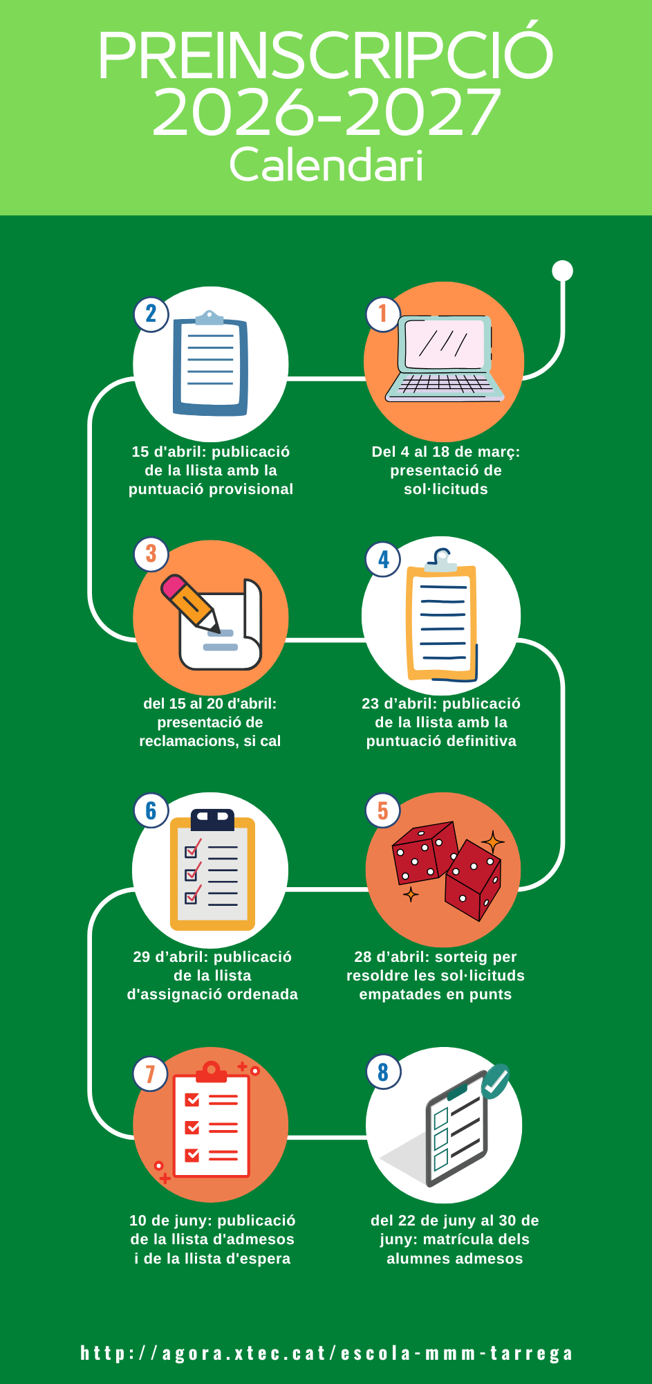 Infografia per seguir al dia el procés de preinscripció per al proper curs 2026-2027, aquí podràs trobar les dates més importants per a fer-ne un bon seguiment.
